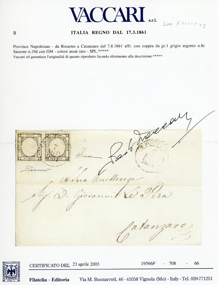 1861 - 1 grano grigio argento (19d), coppia, perfetta e ben marginata, su lettera da Rossano 7/8/1861 a Catanzaro. Rara tonalità. Occasione. Avanzo, R.Diena, cert. Vaccari. Ex coll. Imperato.