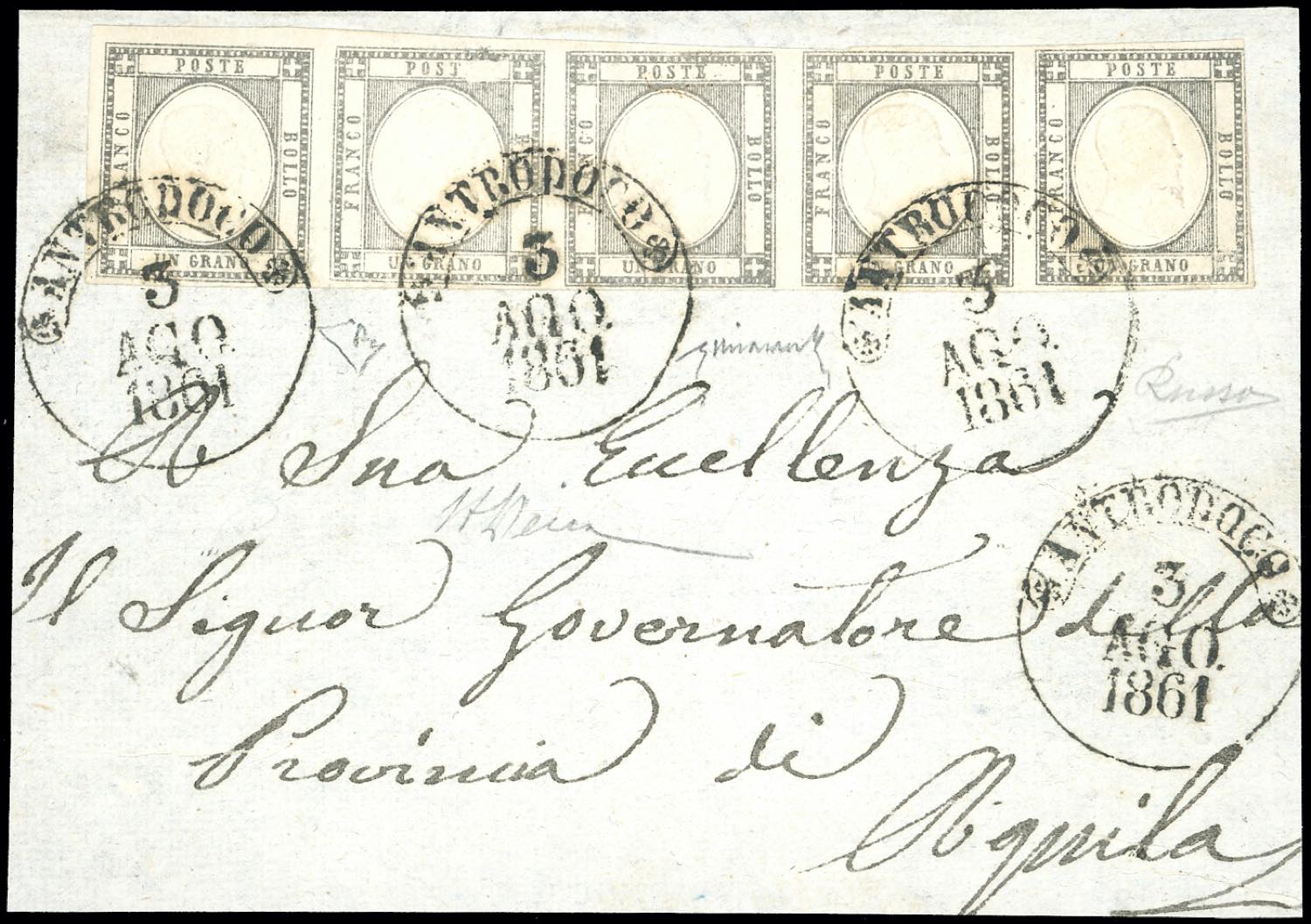 1861 - 1 grano grigio (19da), striscia orizzontale di 5, il secondo esemplare con varietà "senza E di POSTE", ottimo stato, su frontespizio di lettera da Antrodoco 3/8/1861 a L'Aquila. INSIEME UNICO di eccezionale freschezza e rarità. Russo, E.Diena, Chiavarello, cert. A.Diena. (cat.Sassone € 525.000++ in proporzione).