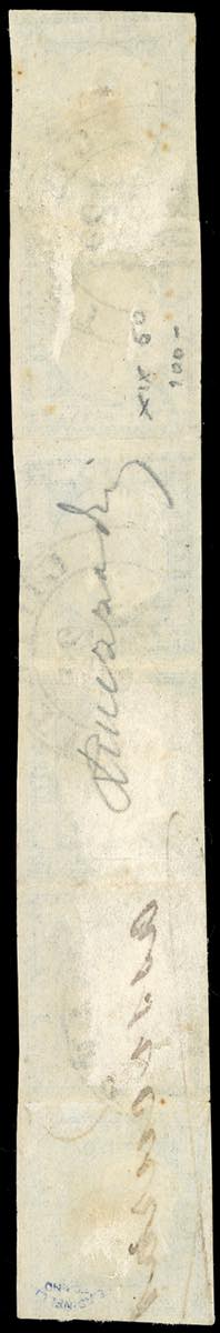 1861 - 2 grana azzurro chiaro (20), striscia verticale di sei, ottimo stato, usata a Chieti 22/4/1861. Estremamente rara, si tratta probabilmente della massima striscia nota usata. Mezzadri.