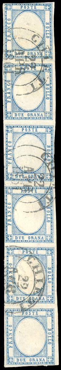 1861 - 2 grana azzurro chiaro (20), striscia verticale di sei, ottimo stato, usata a Chieti 22/4/1861. Estremamente rara, si tratta ... Leggi tutto