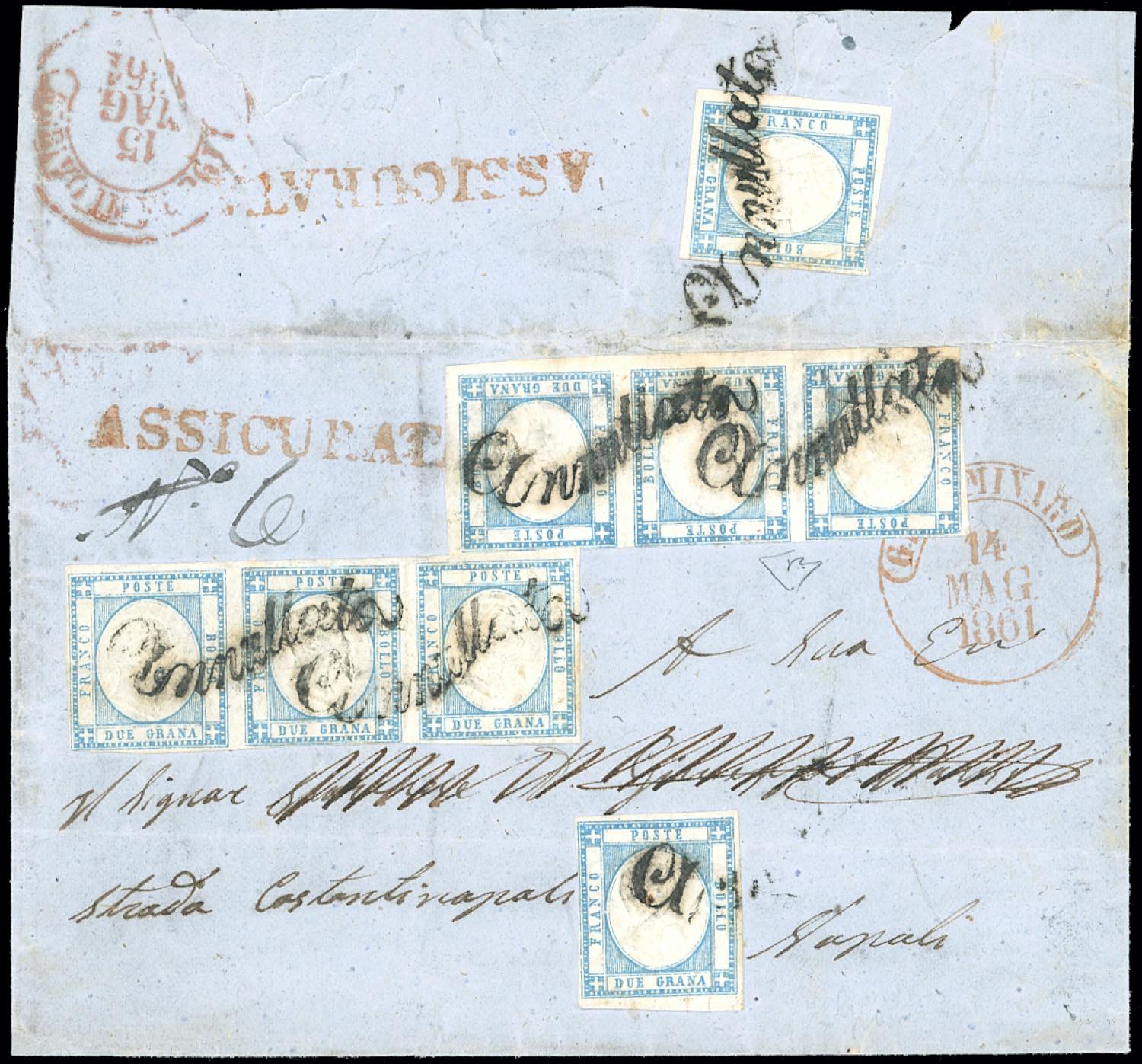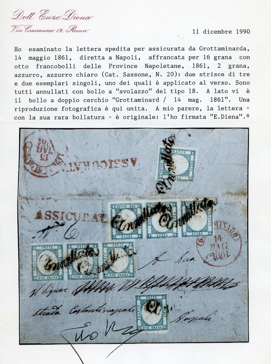 1861 - 2 grana azzurro chiaro (20), due strisce di tre e due singoli, uno dei quali applicato al verso, su sovracoperta di lettera assicurata da Grottaminarda 14/5/1861 a Napoli. Tutti i francobolli sono annullati con il raro bollo a svolazzo della località di partenza, punti R1. Insieme unico, di grande impatto visivo. Cert. E.Diena. Ex coll. Imperato.