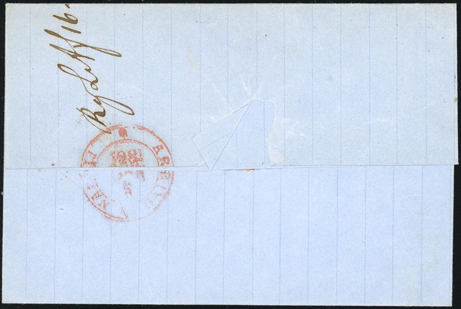 1861 - 2 grana azzurro, doppio filetto di inquadratura in alto (20ka), perfetto, su sovracoperta di lettera da L'Aquila, svolazzo + cerchio rosso, punti 10, a napoli. Rara la varietà così evidente. Ferrario.