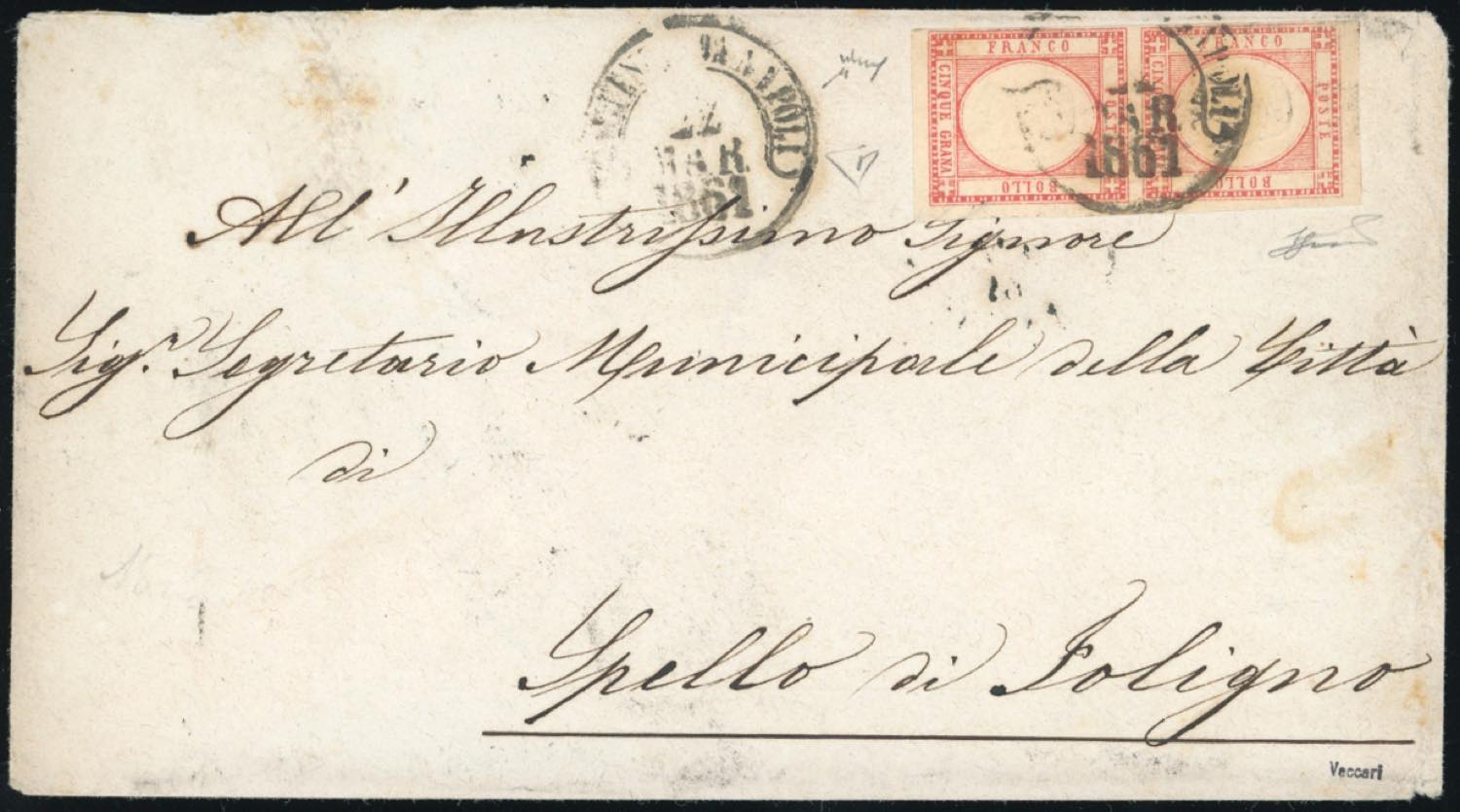 1861 - 5 grana rosso carminio (21), coppia verticale, perfetta, su busta da Napoli 22/3/1861 a Spello. E.Diena, Chiavarello, Ferrario. Ex coll. Imperato.