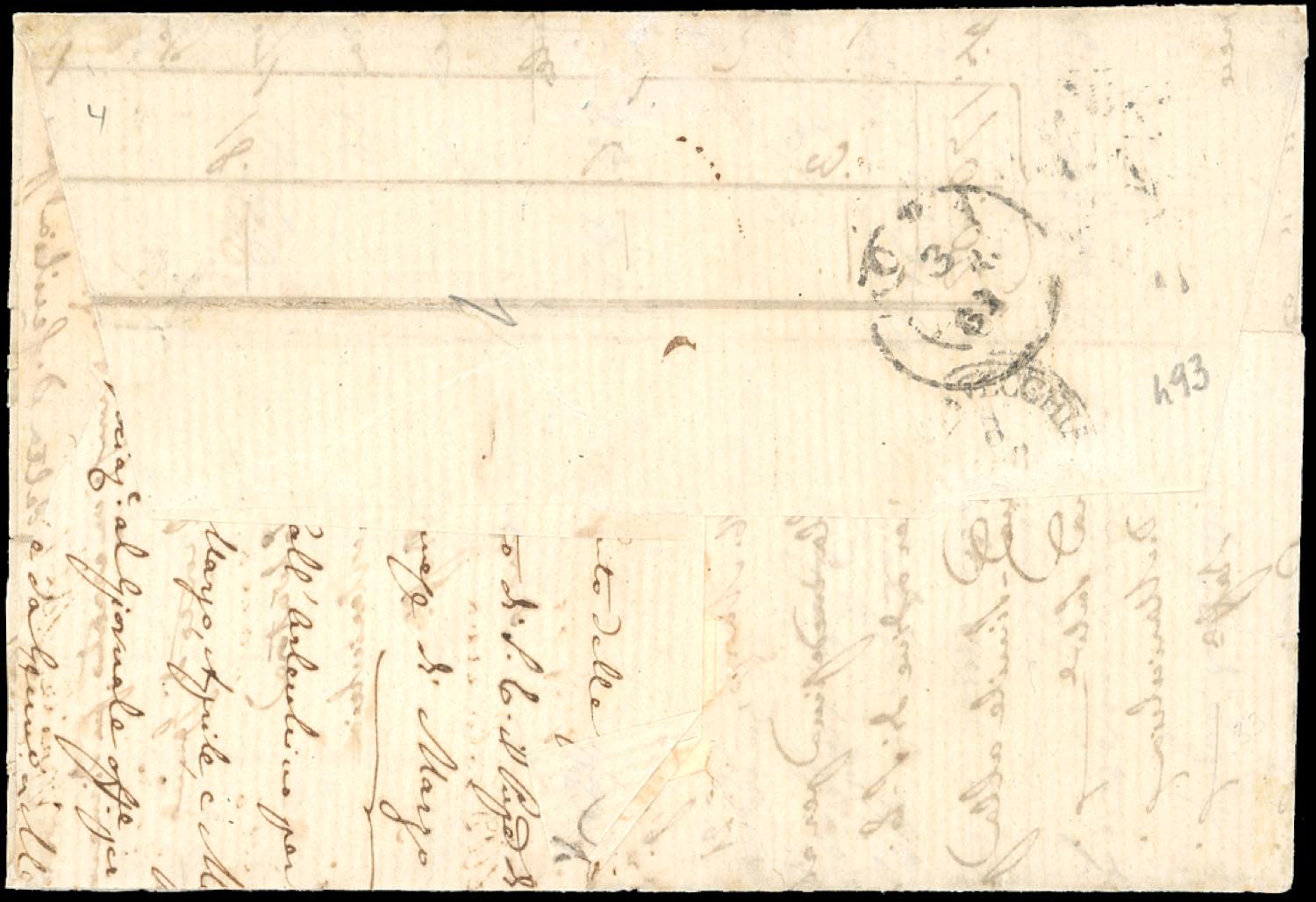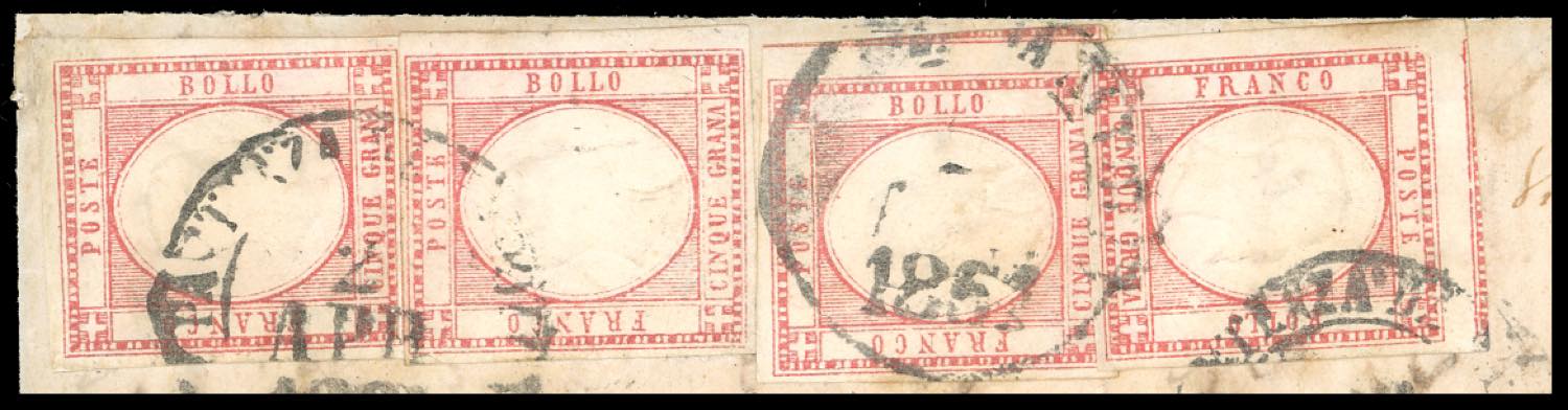 1861 - 5 grana rosso carminio (21), quattro esemplari, perfetti, su lettera da Napoli 2/4/1861 a Roma, bollo "Civitavecchia via di mare" ... Leggi tutto