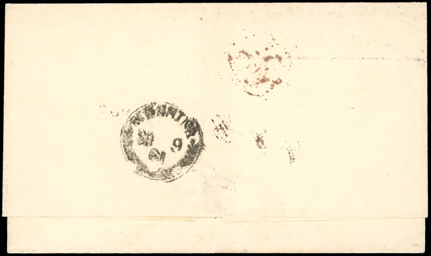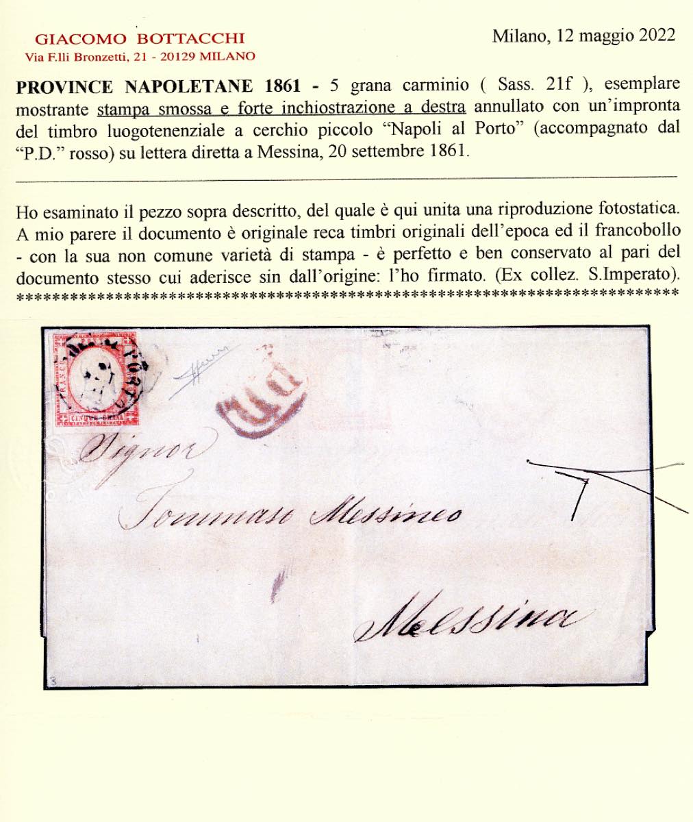 1861 - 5 grana carminio (21f), stampa smossa e forte inchiostrazione a destra, perfetto, su fresca sovracoperta di lettera da Napoli 20/09/1861 a Messina. Bella e rara varietà, di ottima qualità. Sorani, cert. Bottacchi. Ex coll. Imperato.