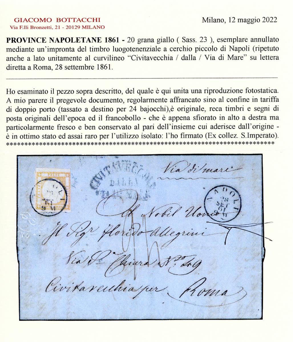 1861 - 20 grana giallo (23), molto fresco, leggermente sfiorato in alto a destra, isolato su lettera da Napoli 28/9/1861 a Roma, bollo della via di mare di Civitavecchia, tassata 24 bajocchi. Uso isolato estremamente raro, di ottimo aspetto. Chiavarello, cert. Bottacchi. Ex coll. Imperato.