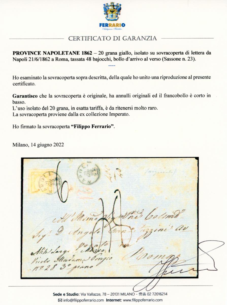 1862 - 20 grana giallo (23), corto in basso, isolato su sovracoperta di lettera da Napoli 21/6/1862 a Roma, tassata 48 bajocchi. USO ISOLATO MOLTO RARO. Ex coll. Imperato. Cert. Ferrario.
