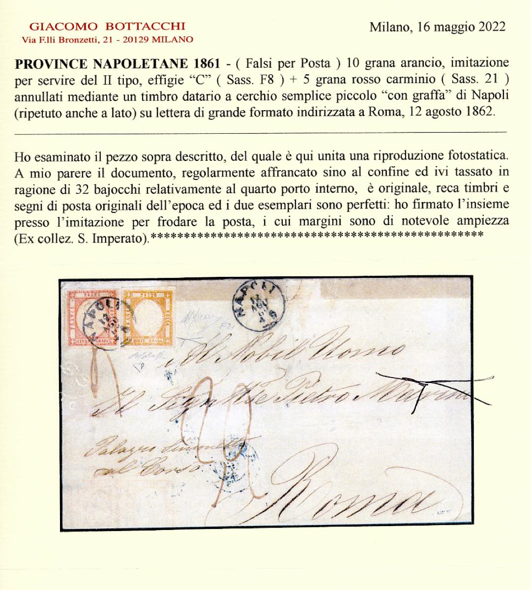 1862 - 10 grana arancio, falso per posta del II tipo, effigie C, 5 grana rosso carminio (F8,21), perfetti, su sovracoperta di lettera da Napoli 12/8/1862 a Roma, tassata 32 baj per il quarto porto interno pontificio. Molto rara. G.Bolaffi, A. ed E.Diena, cert. Bottacchi. Ex coll. Imperato.