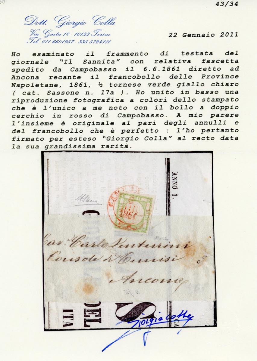 CAMPOBASSO, doppio cerchio grande rosso punti R2 - 1/2 tornese (17a), perfetto, isolato su fascetta con parte di giornale del 6/6/1861 per Ancona. Unico noto, splendida rarità del settore. Cert. A.Diena e Colla.