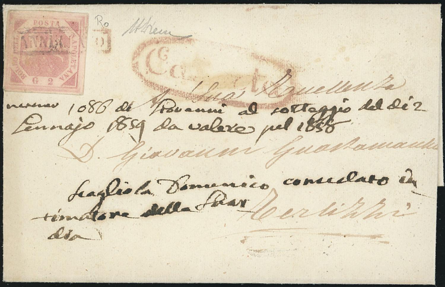 CASERTA, annullato + ovale rossi punti 10 - 2 grana (5), perfetto, su sovracoperta di lettera per Terlizzi, al verso transito di Napoli del 18/12/1859. A.Diena.