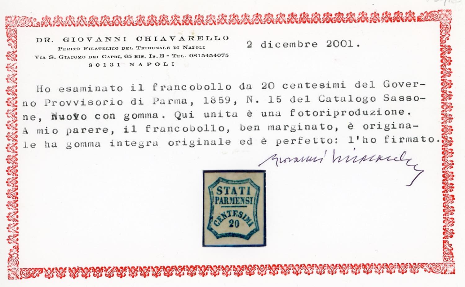 1859 - 20 cent. azzurro (15), gomma originale, perfetto. A.Diena, cert. Chiavarello.