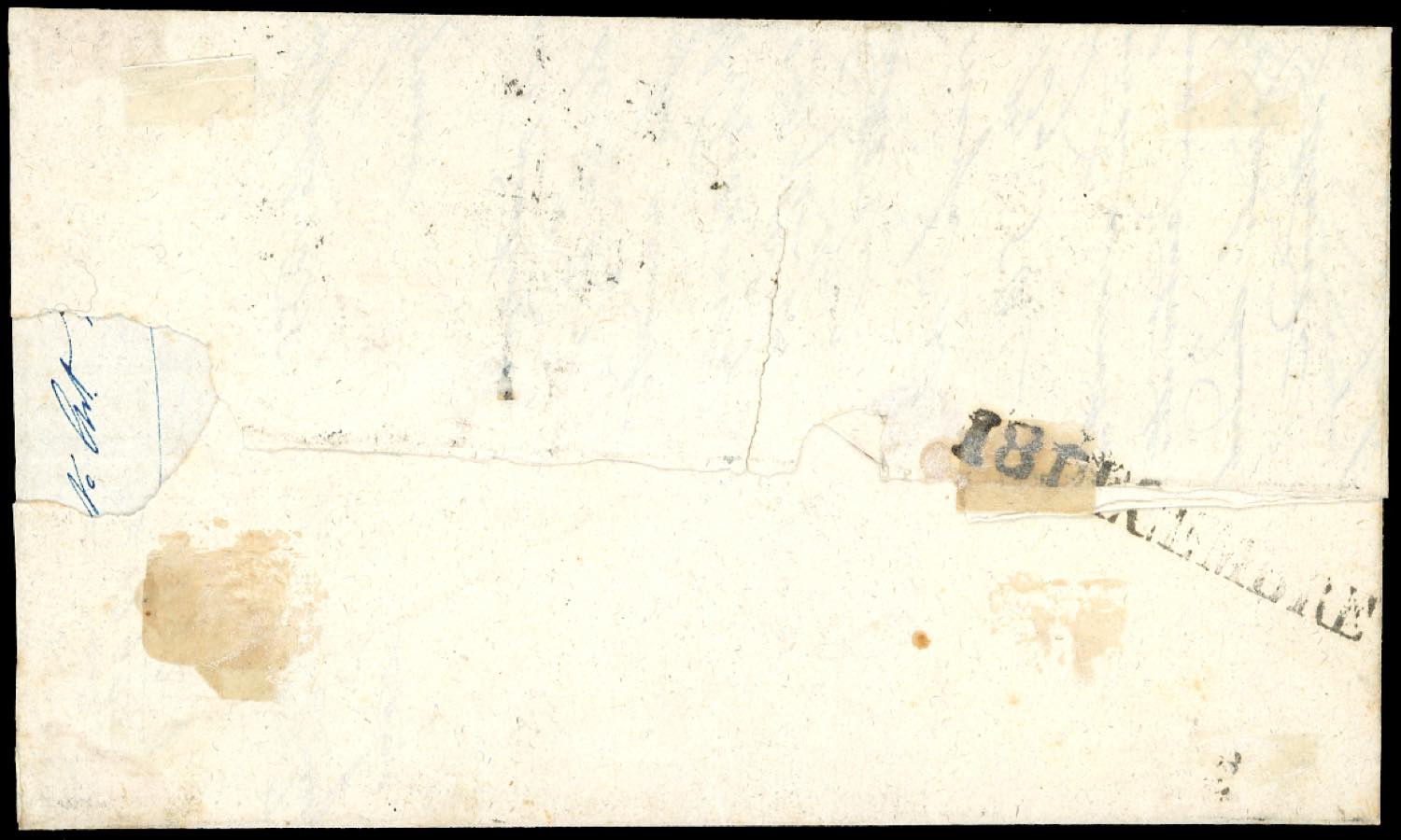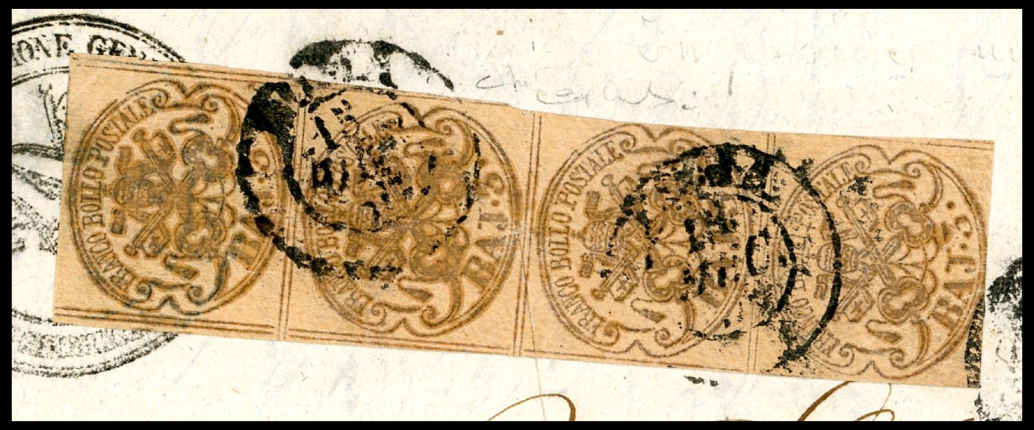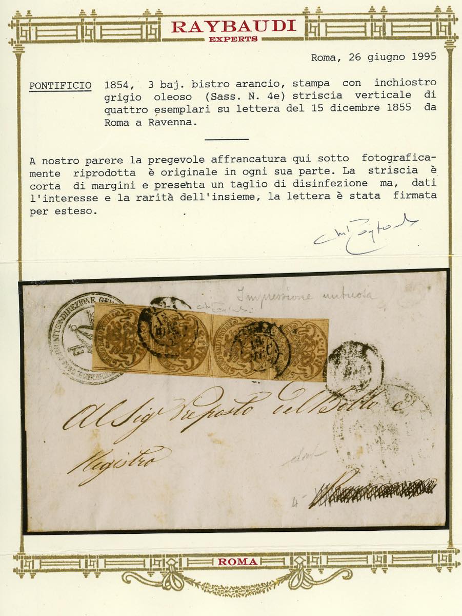 1855 - 3 baj bistro arancio, stampa con inchiostro grigio oleoso (4e), striscia verticale di 4, margini da ampi a leggermente intaccati, su lettera da Roma 15/12/1855 a Ravenna. Un taglio di disinfezione, a testimonianza dell'epidemia di colera dilagante nel periodo, interessa anche la striscia, senza costituire un difetto. Raro multiplo di questa particolare tiratura. Cert. Oro Raybaudi. Ex coll. Imperato.