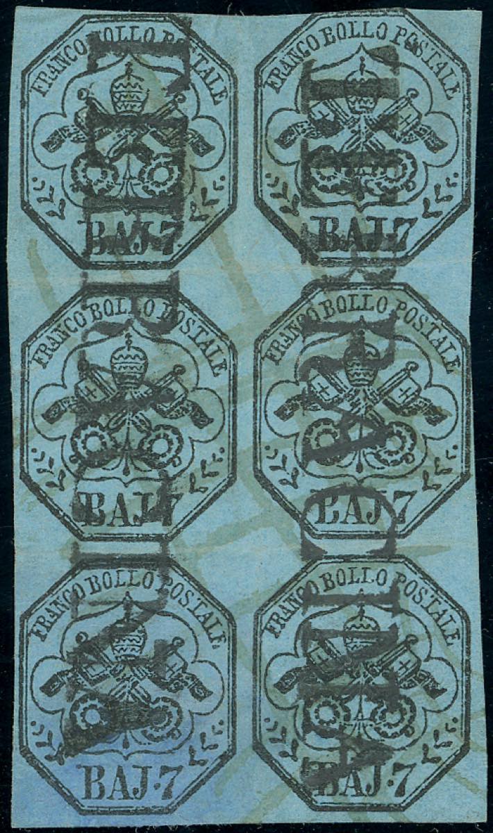 1852 - 7 baj azzurro (8), blocco di sei, due margini sfiorati/leggermente intaccati, usato a Terracina. Pregevole blocco con annullo lineare. Ex coll. Imperato. (cat. Sassone ca € 7.500)