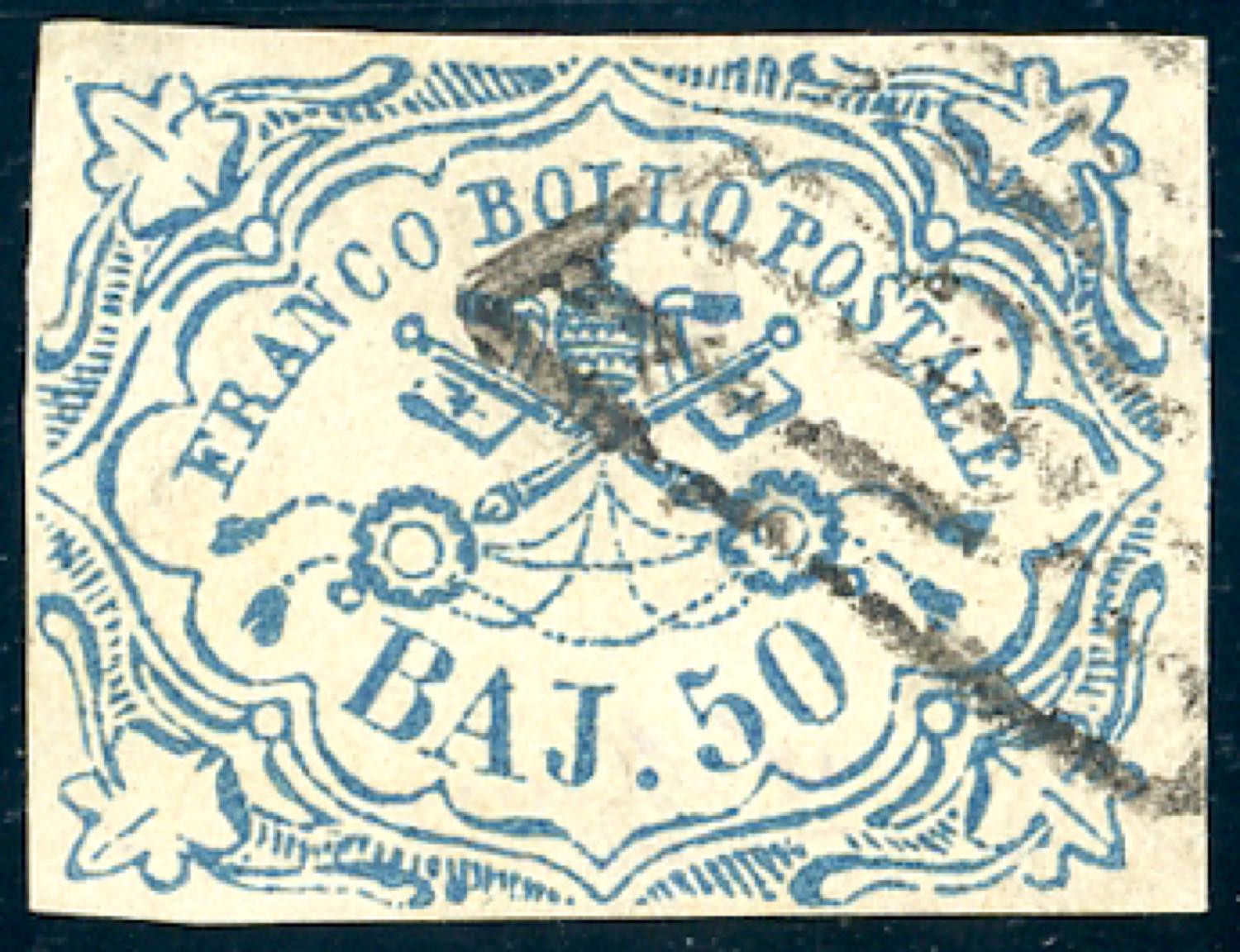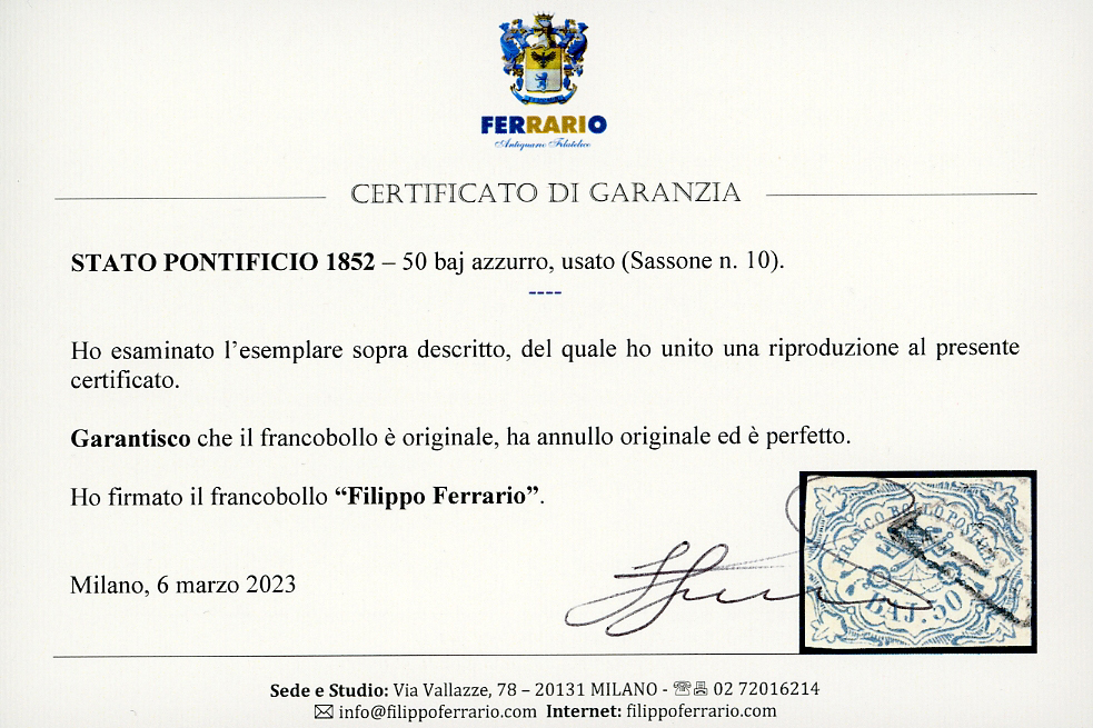 1852 - 50 baj azzurro (10), usato, perfetto. E.Diena, G.Oliva, cert. Ferrario.