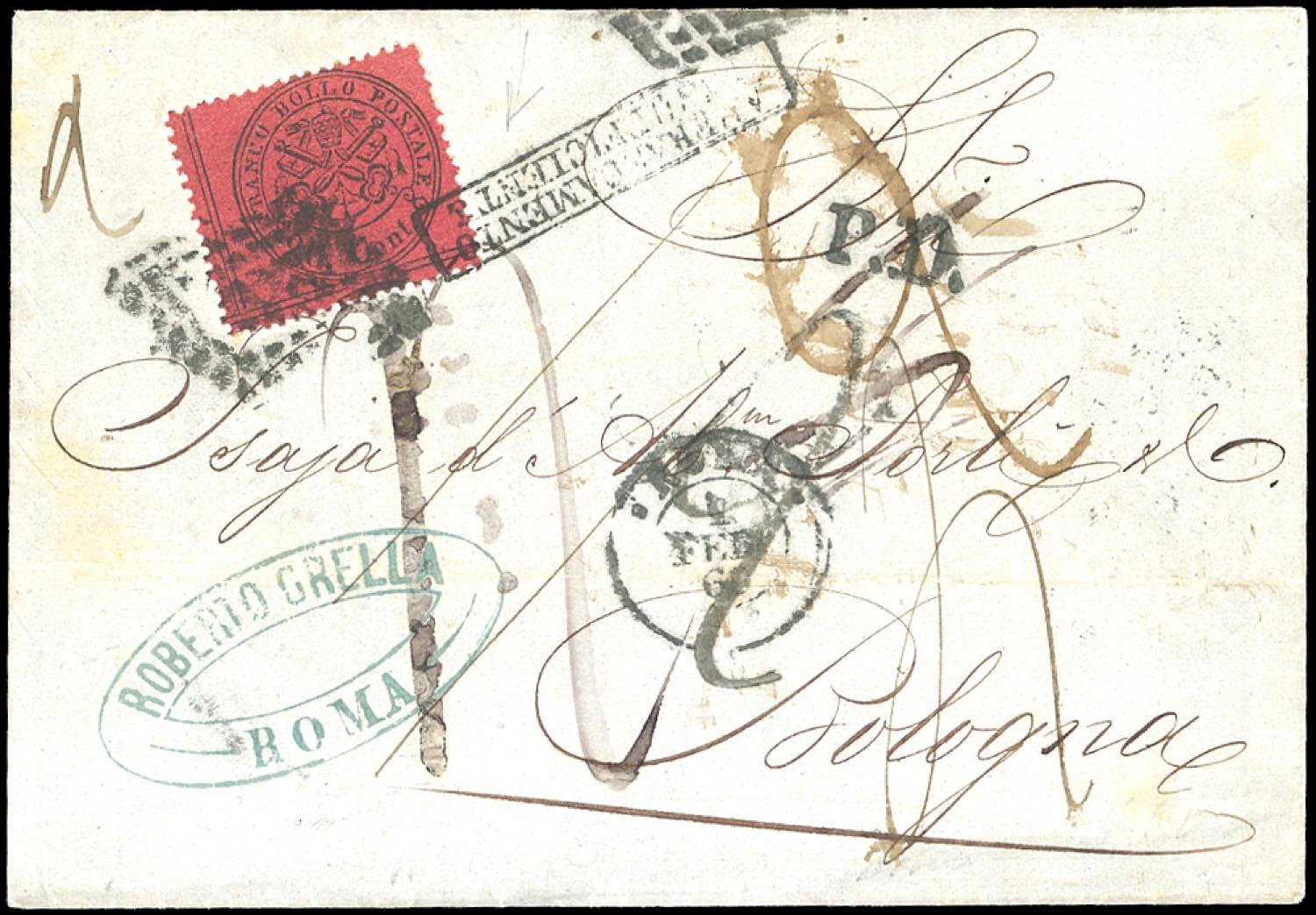 1869 - 20 cent. rosso bruno (27), perfetto, su lettera di doppio porto insuffcientemente affrancata da Roma 1/2/1869 a Bologna, dove venne inizialmente tassata per soli 20 cent. ad integrazione del porto mancante, poi cassati e corretti in 40 cent., dal momento che la Convenzione postale non prevedeva il conteggio parziale delle affrancature insufficienti. Interessante.