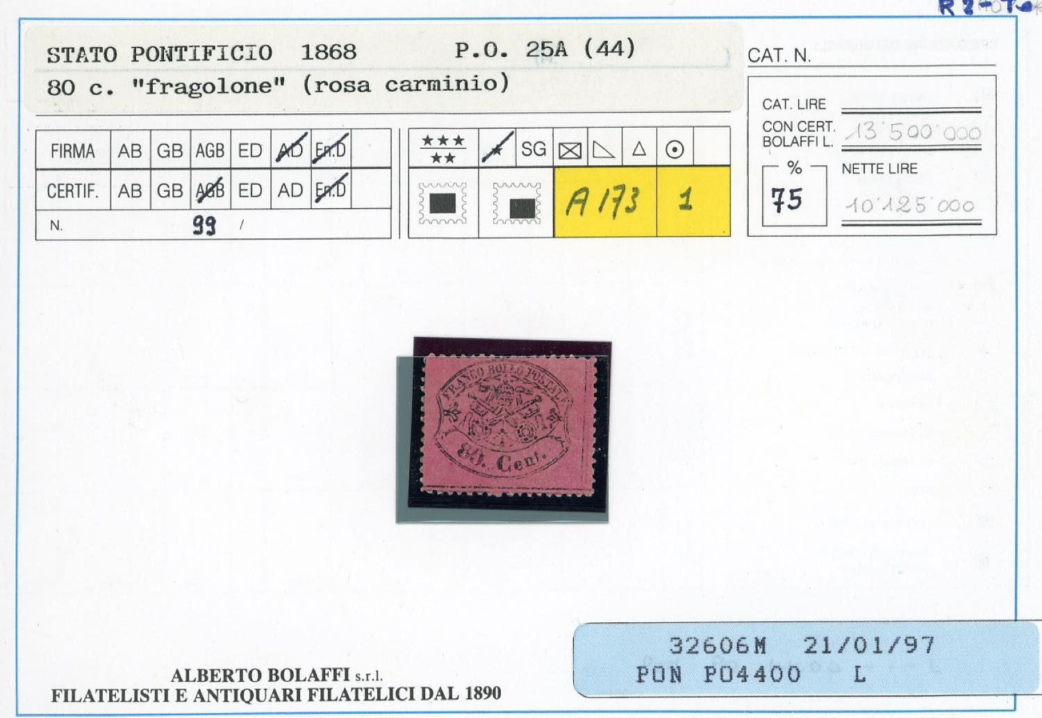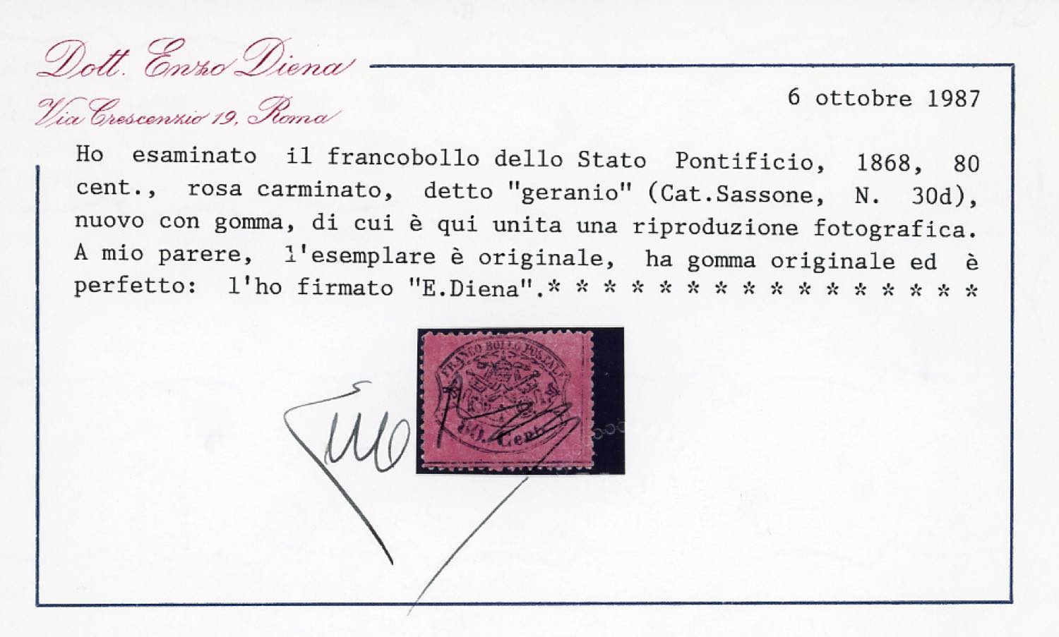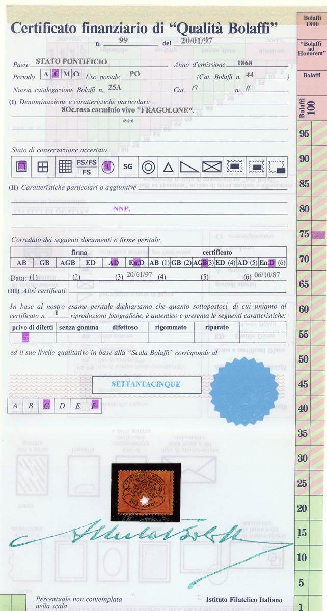 1870 - 80 cent. rosa carminato, "Fragolone" (30d), gomma originale, perfetto e di grande freschezza. Molto bello. Raybaudi, A.Diena, cert. E.Diena e Finanziario Bolaffi 75%.