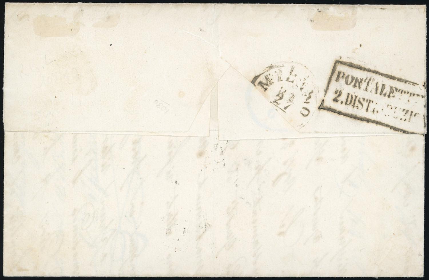 1855 - 8 baj bianco, falso per posta di Bologna, I tipo, otto filetti (F4), perfetto, su lettera da Bologna 26/6/1855 a Milano. Splendida e molto rara! Una delle più belle lettere note con questo falso. E.Diena, Avanzo. Ex coll. Andreotti.