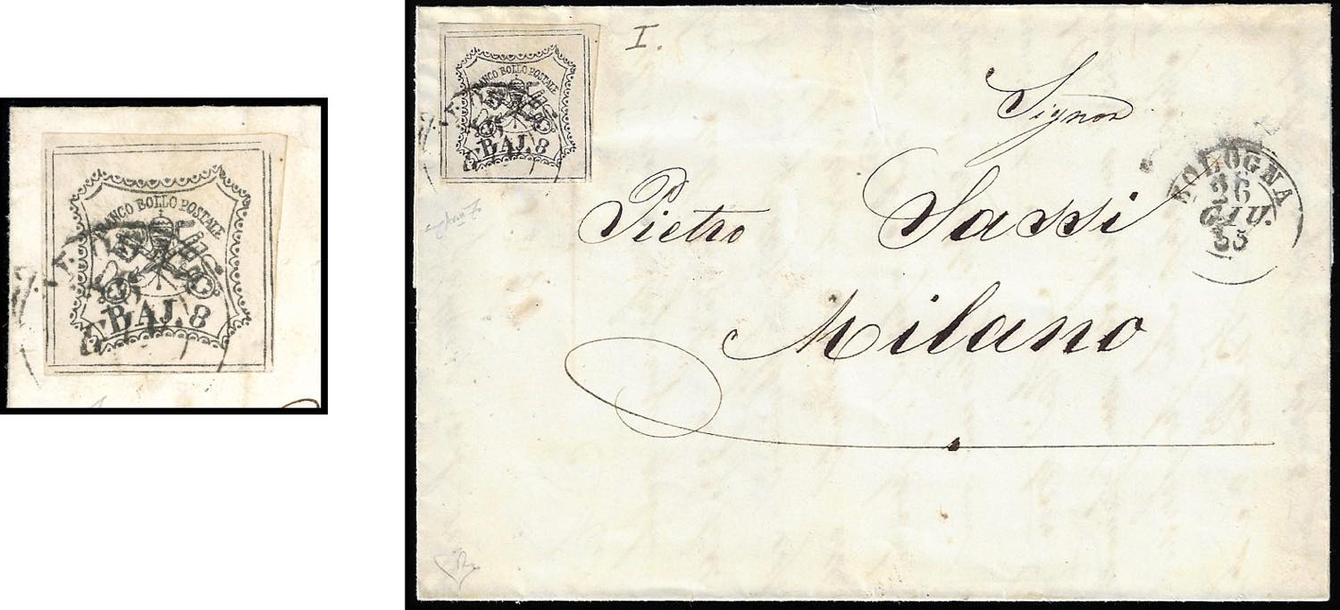 1855 - 8 baj bianco, falso per posta di Bologna, I tipo, otto filetti (F4), perfetto, su lettera da Bologna 26/6/1855 a Milano. Splendida e ... Leggi tutto
