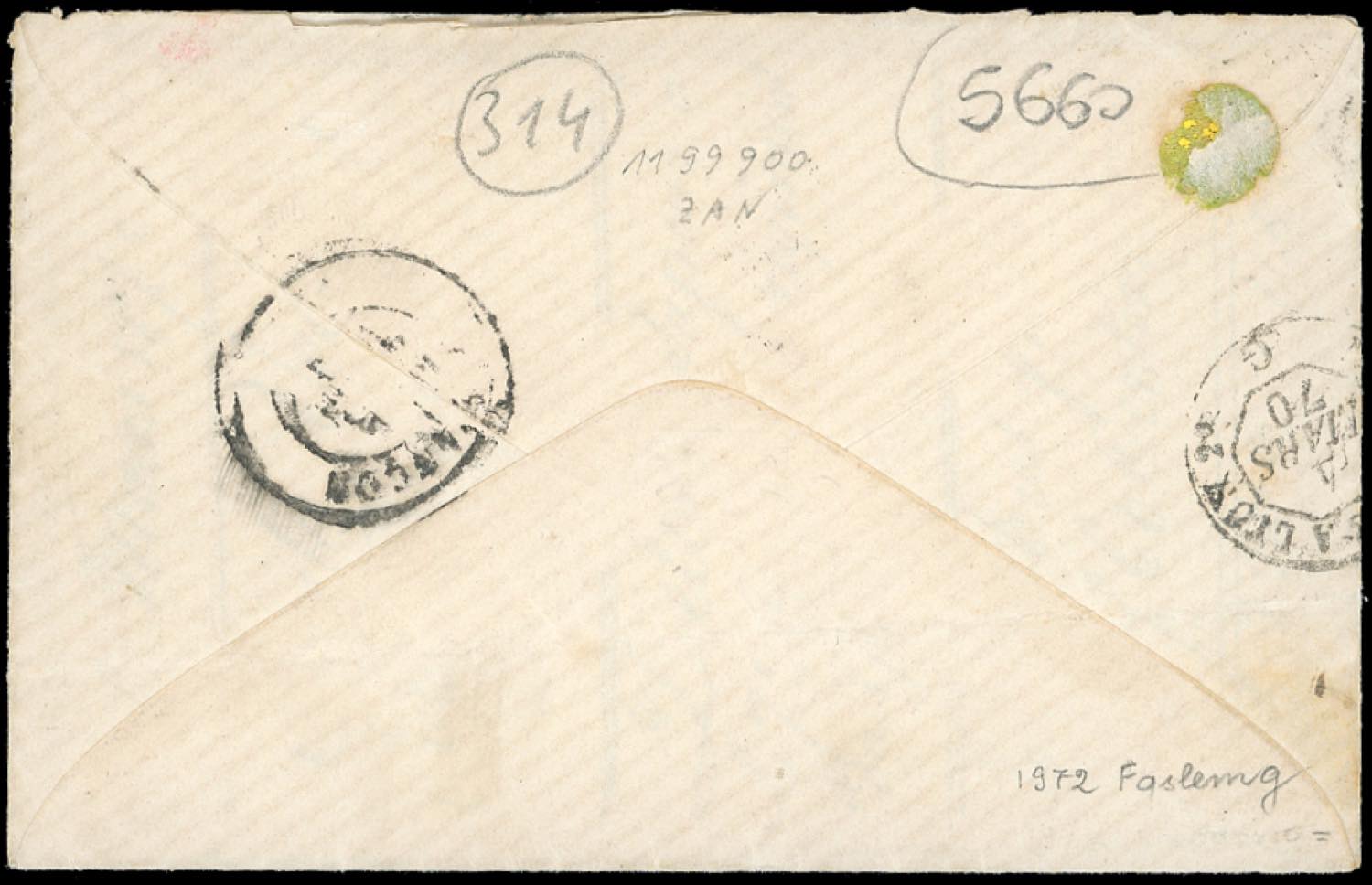 1870 - 20 cent. Napoleone laureato (Francia 29), perfetto, su busta inviata dall'ufficio di posta militare francese Corps Expeditionaire Rome 3/3/1870 a Boub, francobollo annullato con la griglia a punti "Cer" (punti R3). Testimonianza della presenza francese nell'anno della presa di Roma. G.Bolaffi, Ferrario (cat.Sassone € 35.000/52.500).