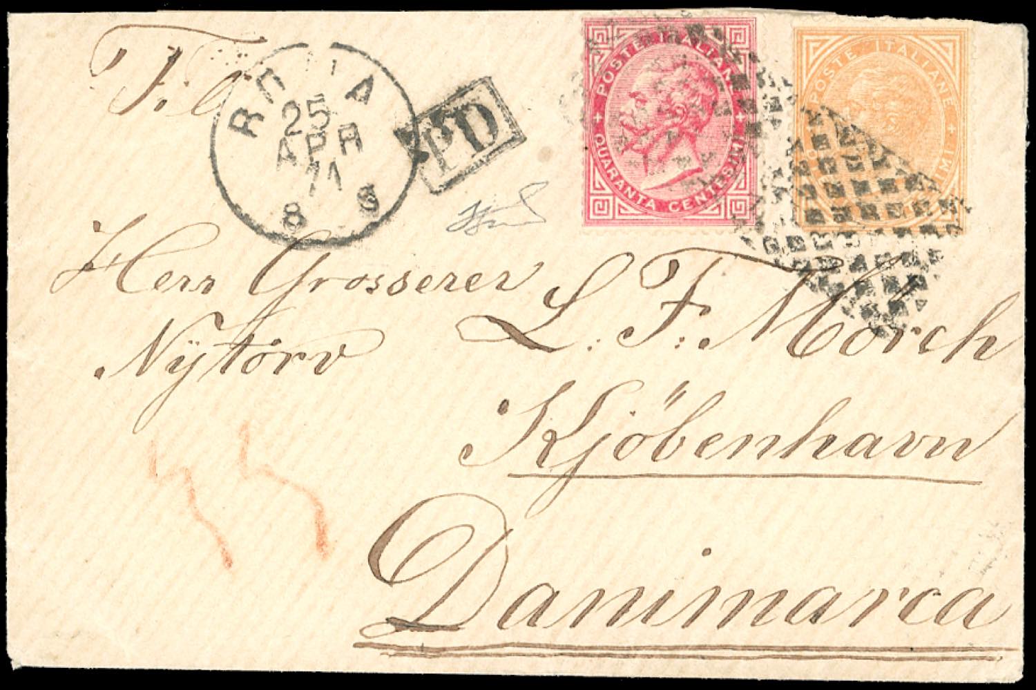 1871 - 10 cent. e 40 cent. De La Rue, tiratura di Torino (T17,T29), annullati con il muto a rombi di fornitura italiana su fresca busta da Roma 25/4/1871 per la Danimarca. Interessante destinazione. Ferrario ex coll. Imperato.