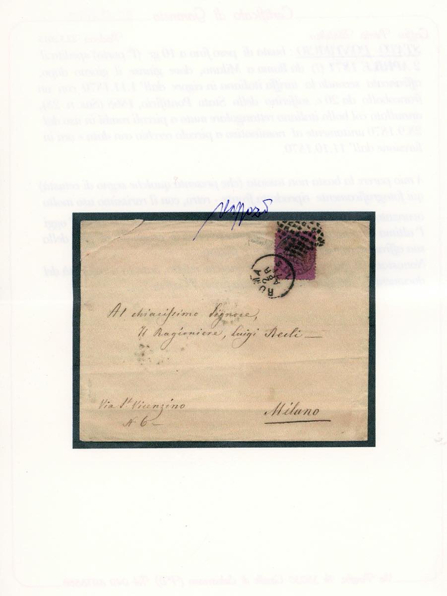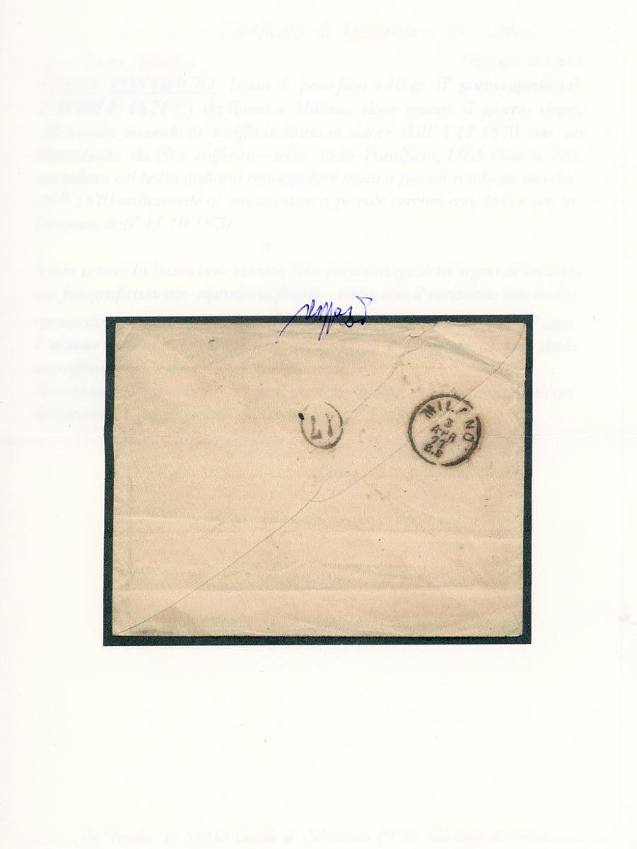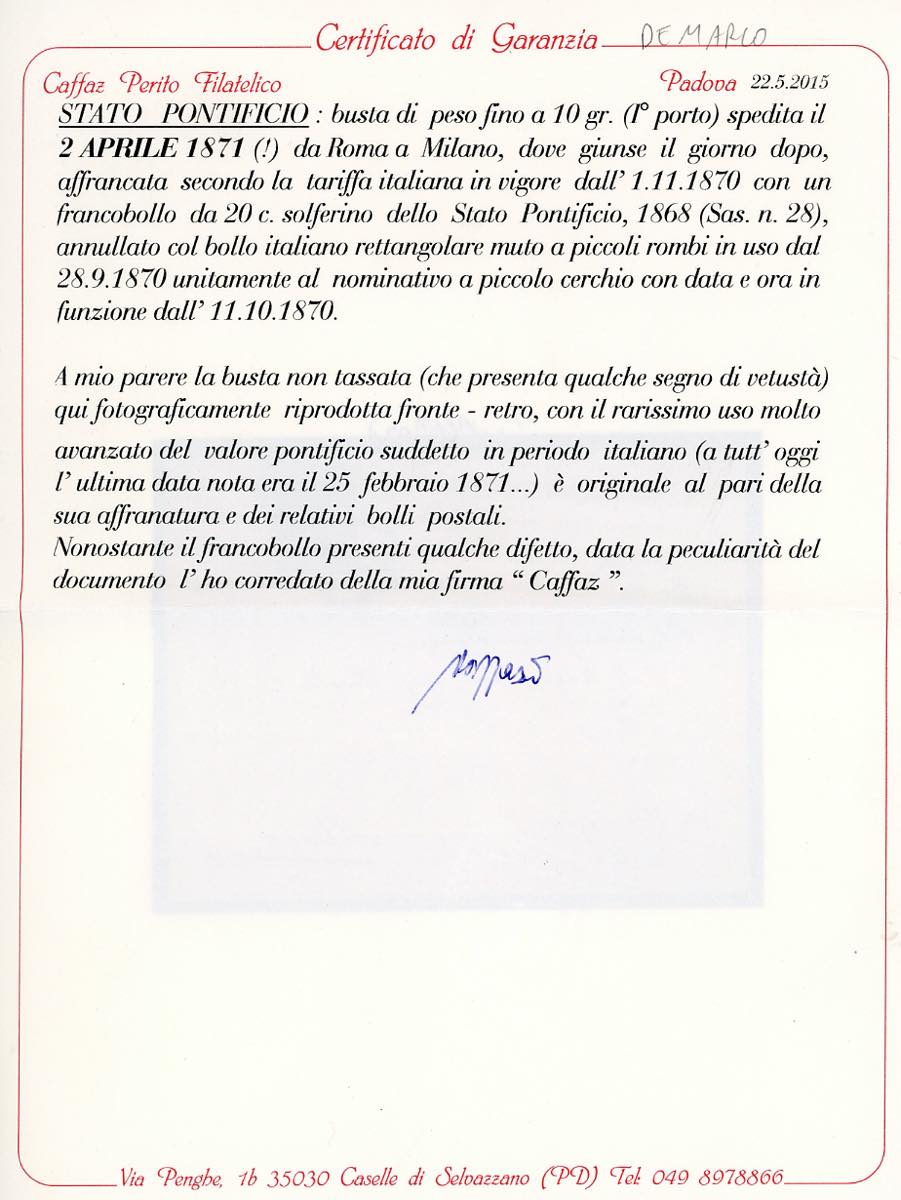 1871 - 20 cent. solferino (28), applicato difettoso fin dall'origine, su busta da Roma 2/4/1871 a Milano, in perfetta tariffa, ritenuta valida nonostante l'utilizzo quattro mesi dopo la fine della validità ufficiale (31/12/1870), e non tassato. Si tratta dell'ULTIMA DATA NOTA di utilizzo postale di questo valore, nonché della penultima per tutta l'emissione in centesimi! Grande rarità del settore, per specialista. Cert. Caffaz.