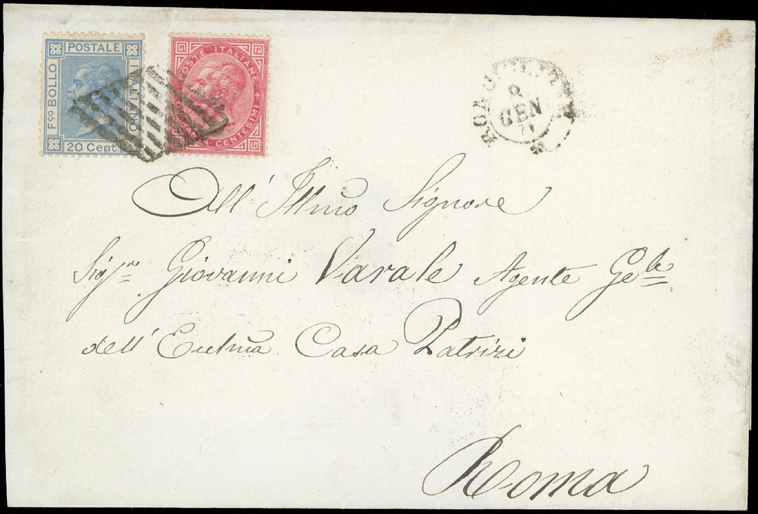 1871 - 40 cent. De la Rue, 20 cent. celeste chiaro (L20,L26), perfetti, su sovracoperta di lettera da Ronciglione 8/1/1871 (punti 12) a Roma. Rara e di bella qualità.