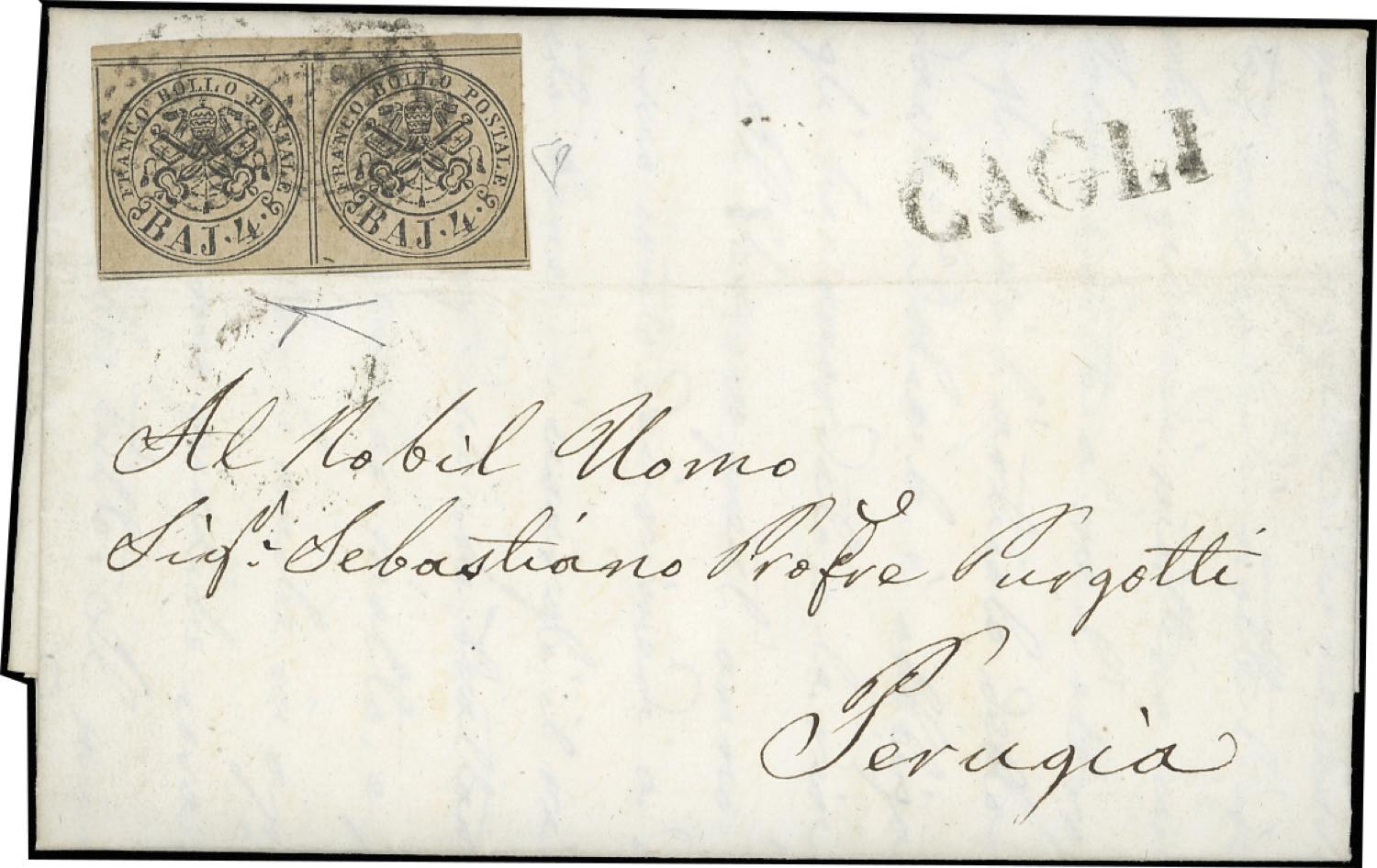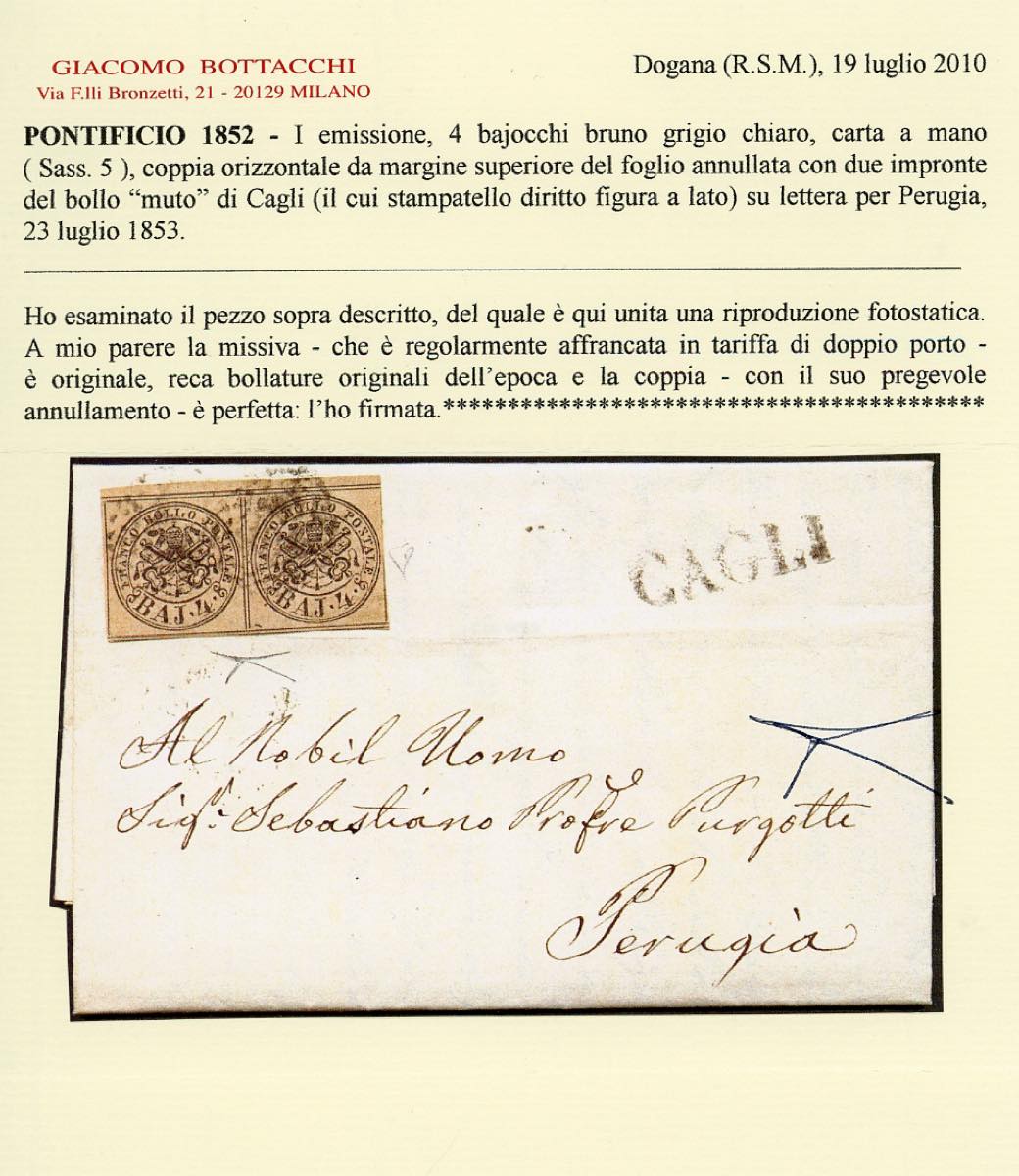 CAGLI, M punti 12 - 4 baj (5), coppia, perfetta, su fresca lettera del 23/7/1853 a Perugia. Rara e di ottima qualità. E.Diena, cert. Bottacchi.