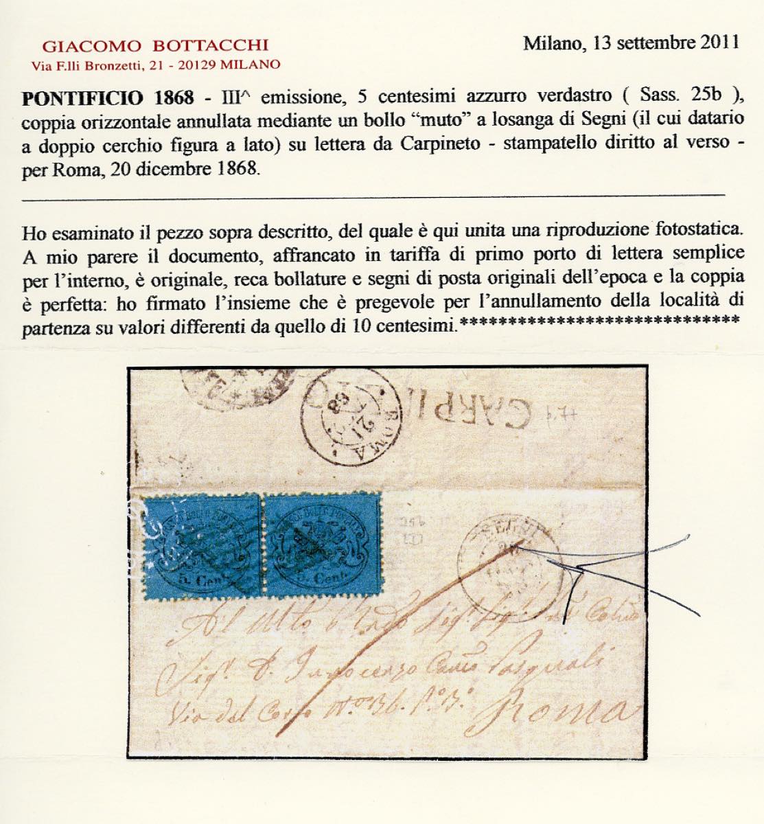 CARPINETO, SD punti 12 - 5 cent., coppia (25b), perfetta, su lettera del 20/12/1868 per Roma. Raro annullo, specie su lettere non affrancate con il francobollo da 10 cent. Cert. Bottacchi.