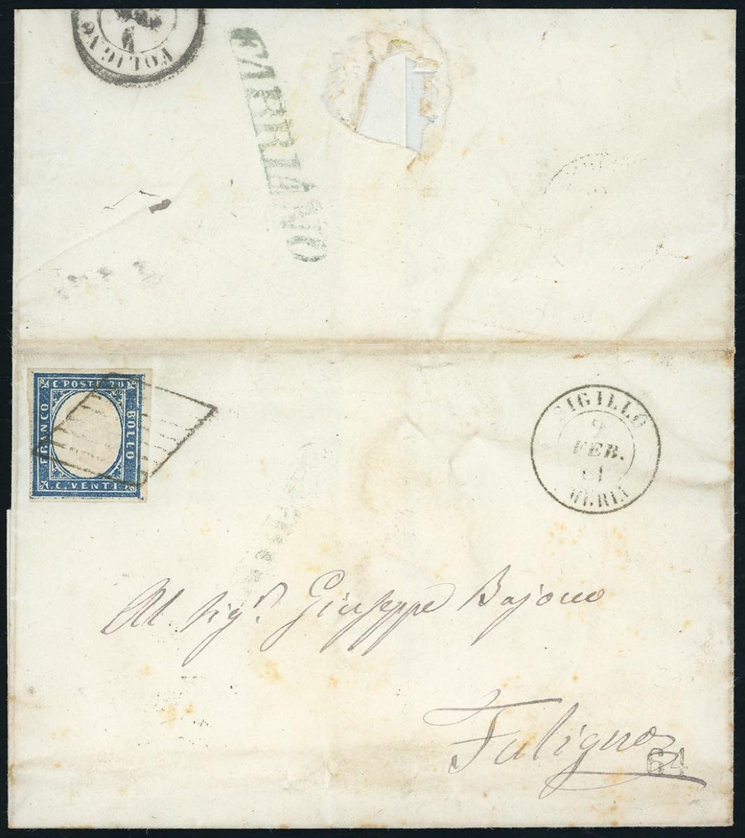 FABRIANO, SI azzurro punti R1 - 20 cent. IV emissione di Sardegna (15Db), perfetto, su lettera del 9/2/1861, transito di Sigillo sul ... Leggi tutto