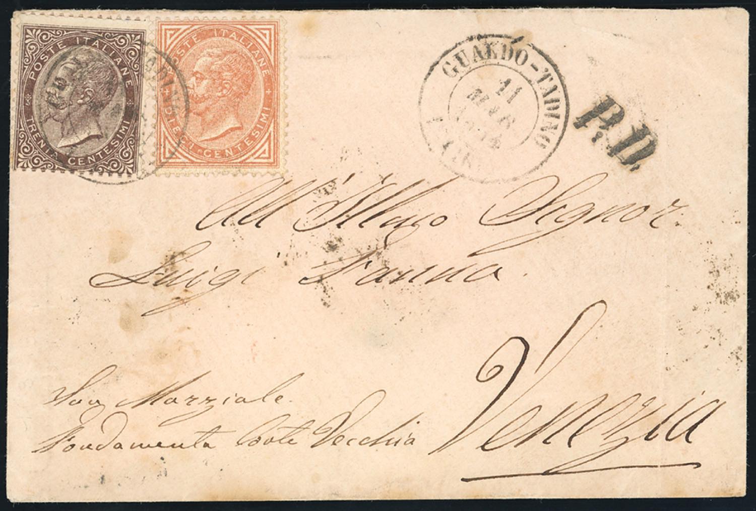 GUALDO TADINO, sardo italiano punti 10 - 10 cent. e 30 cent. De La Rue (L17,L19), perfetti, su busta del 11/3/1864 per Venezia, in PD. Rara.