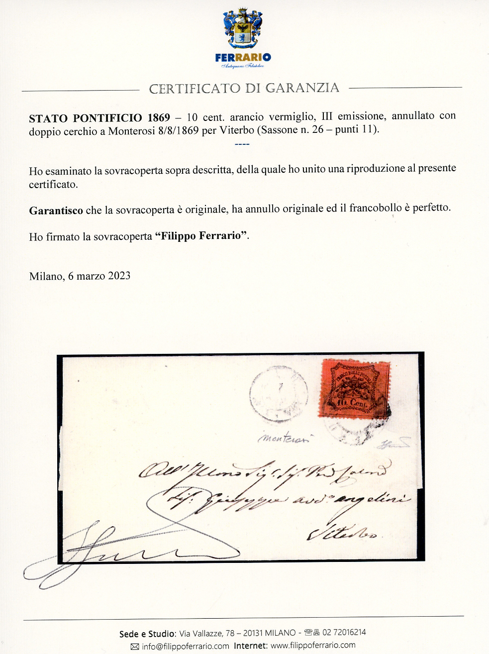 MONTEROSI, 2C s.d. punti 11 - 10 cent. (26), perfetto, su fresca sovracoperta di lettera per Viterbo 8/8/1869. Non comune e sottoquotato. Cert. Ferrario.