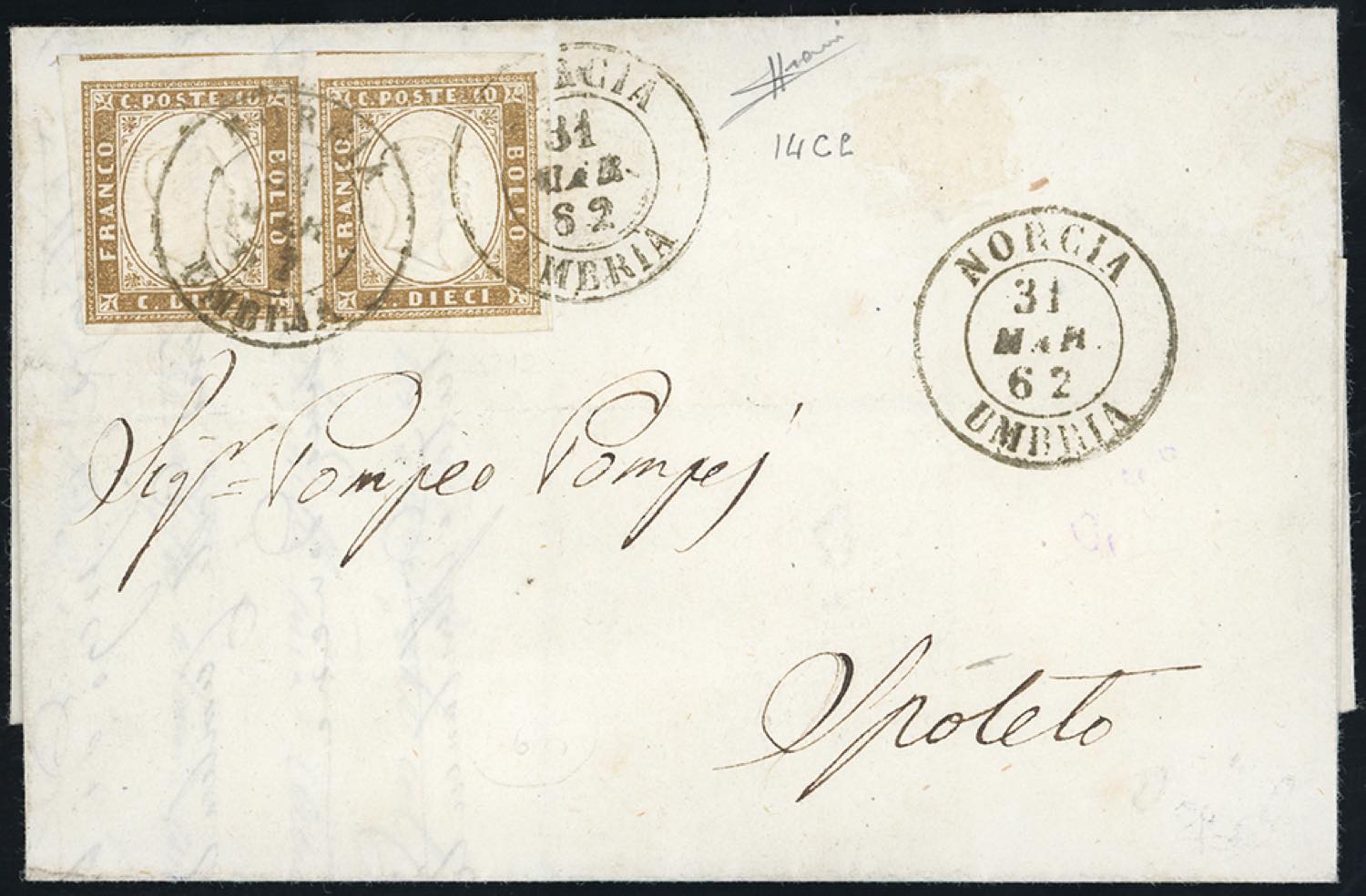 NORCIA, sardo italiano punti 7 - 10 cent. IV emissione di Sardegna (14Cl), coppia, perfetta, su fresca lettera del 31/3/1862 a Spoleto. ... Leggi tutto