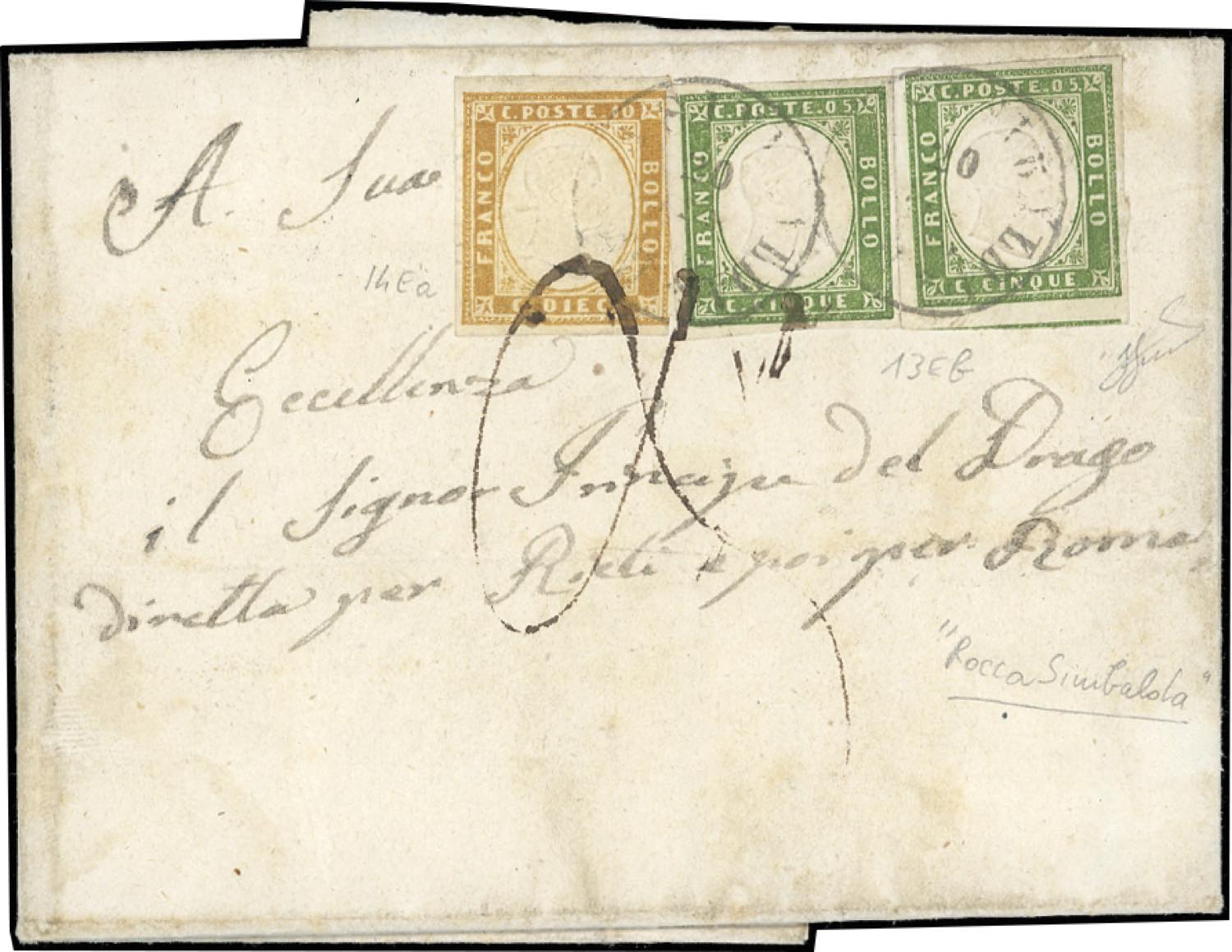 ROCCA SINIBALDA, C1 punti 13 - 5 cent., due esemplari, 10 cent. della IV emissione di Sardegna (13Eb,14Ea), perfetti, su lettera del ... Leggi tutto