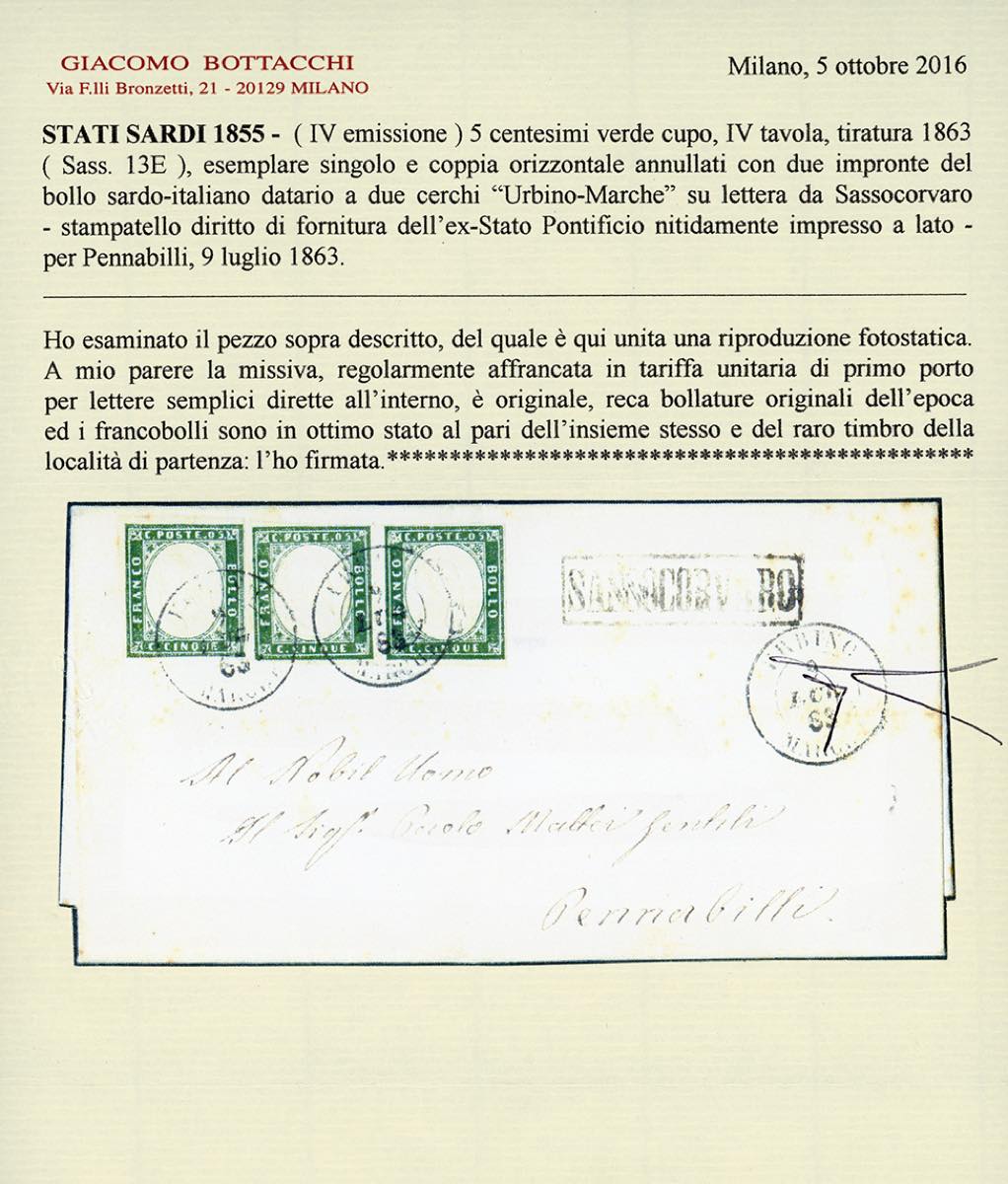 SASSOCORVARO, cartella punti 13 - 5 cent. IV emissione di Sardegna (13E), coppia e singolo, ottimo stato, su lettera del 9/7/1863 per Pennabilli. Rara. Cert. Bottacchi.