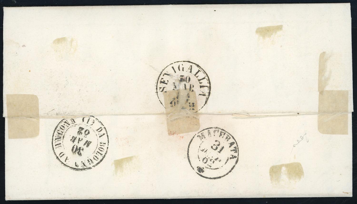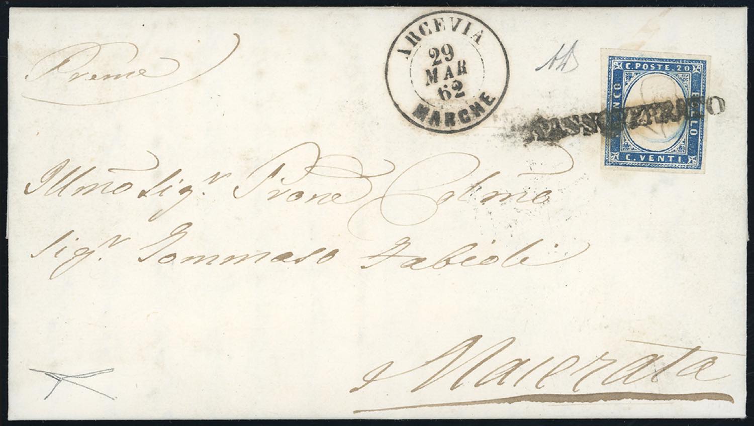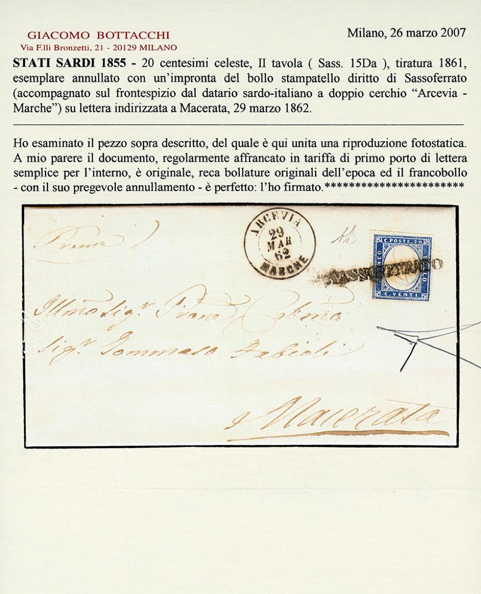 SASSOFERRATO, SD punti R1 - 20 cent. IV emissione di Sardegna (15Da), perfetto e ben marginato, su fresca del 29/3/1862 per Macerata. Raro annullo, lettera di ottima qualità. A.Diena, cert. Bottacchi.