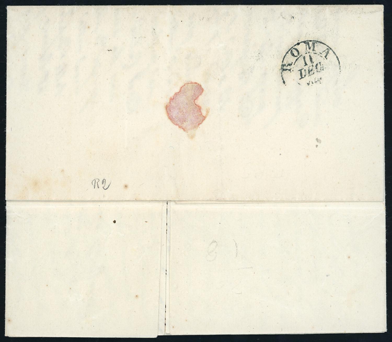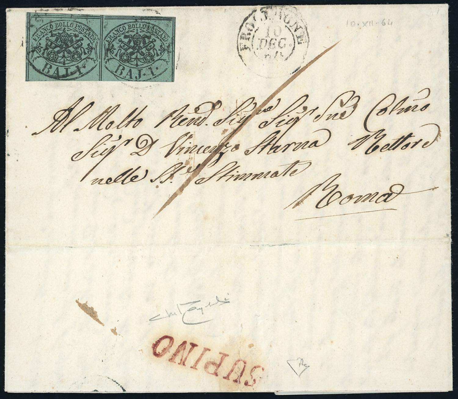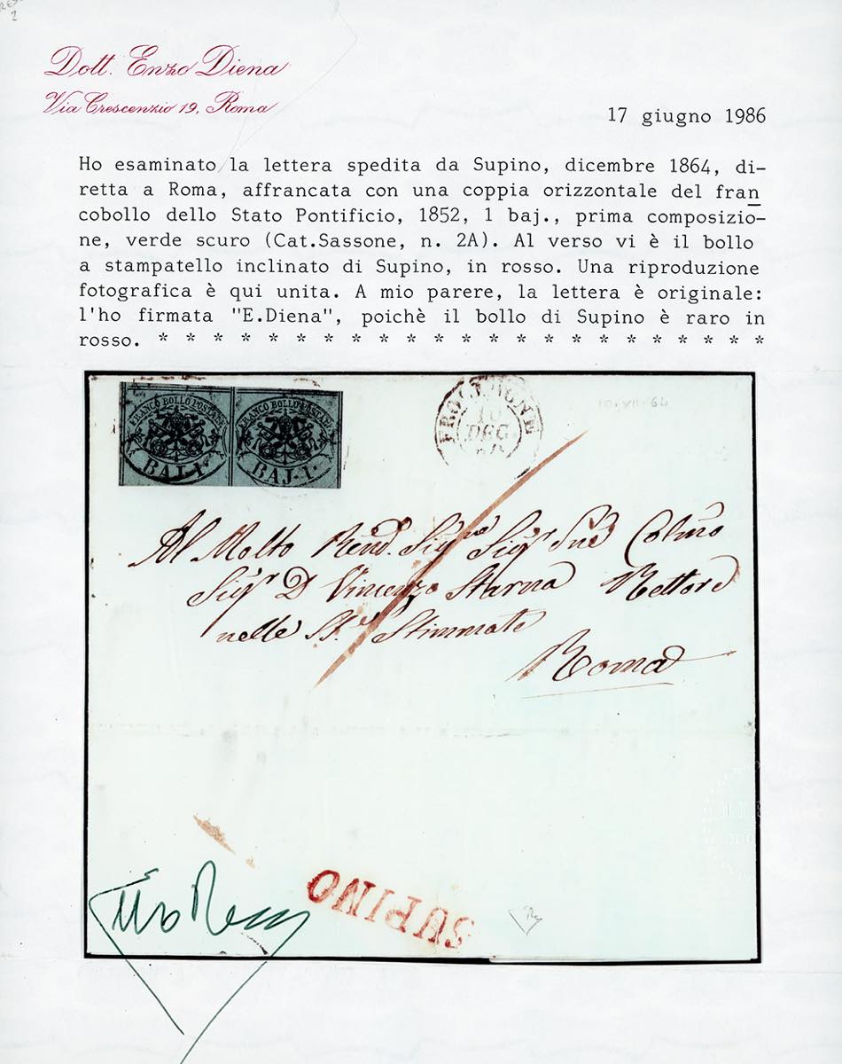 SUPINO, SI in rosso punti R2- 1 baj (2A), coppia, un esemplare sfiorato in basso, su fresca lettera del 10/12/1864 per Roma. Annullo molto raro, lettera di ottimo aspetto. Raybaudi, cert. E.Diena e Bottacchi.