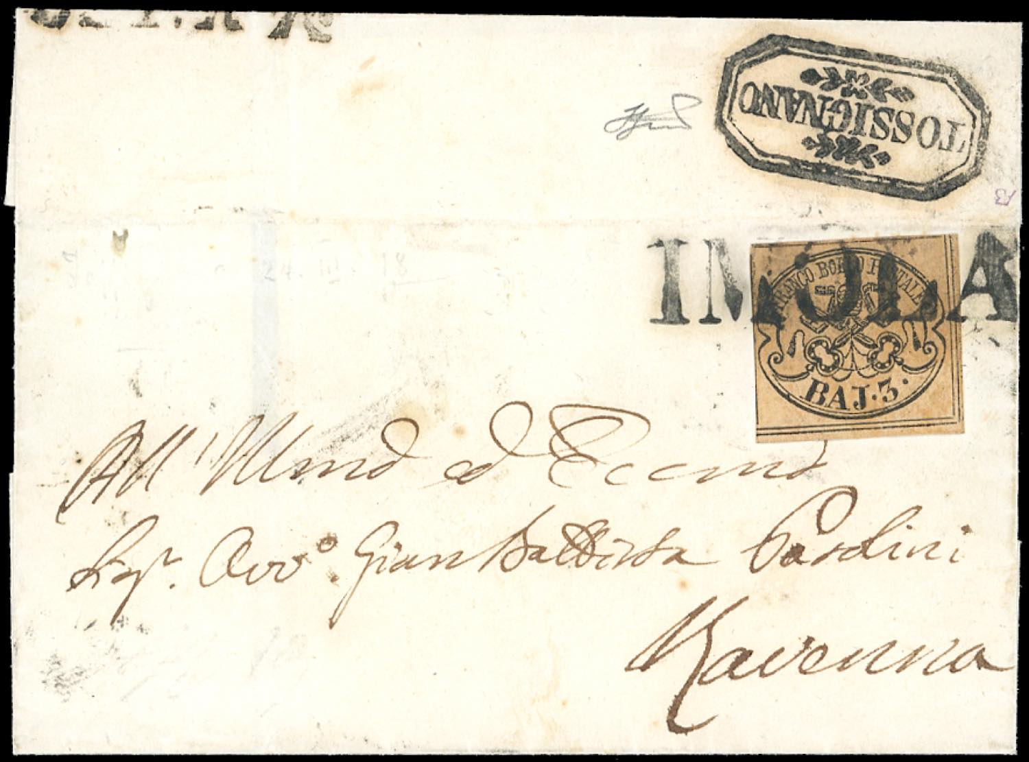 TOSSIGNANO, cart. con fregi punti 9 - 3 baj (4), perfetto e ben marginato, annullato con il lineare di Imola, su lettera da Ravenna 24/3. ... Leggi tutto