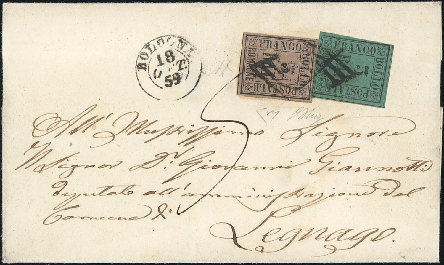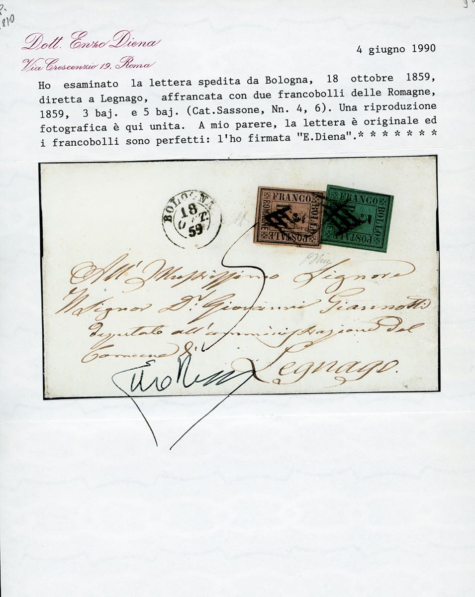 1859 - 5 baj violetto, 3 baj verde scuro (6,4), perfetti, su sovracoperta di lettera da Bologna 18/10/1859 a Legnago, tassata 5 soldi. Cert. A. ed E.Diena.