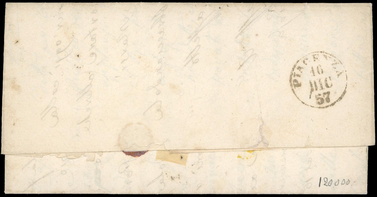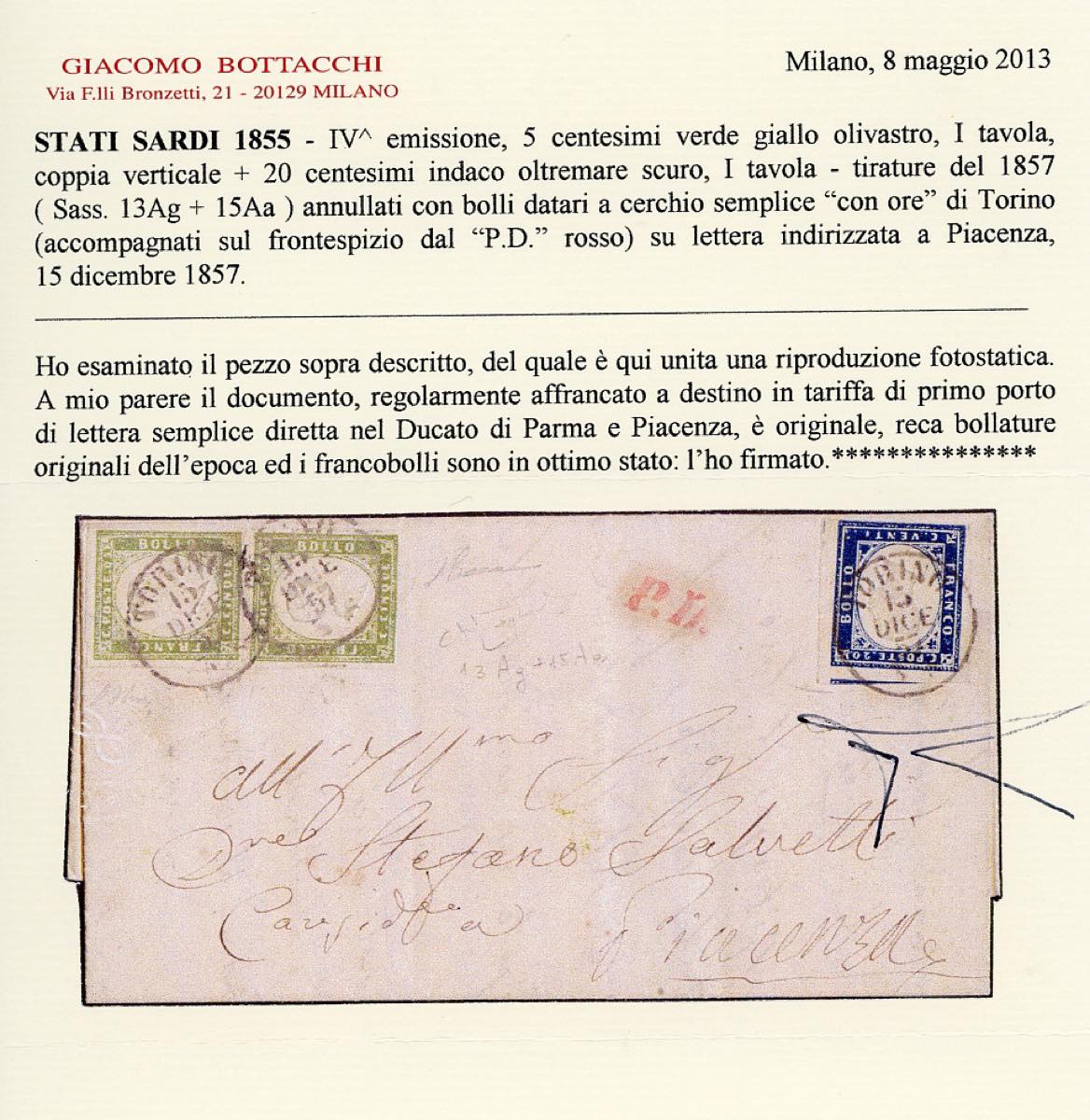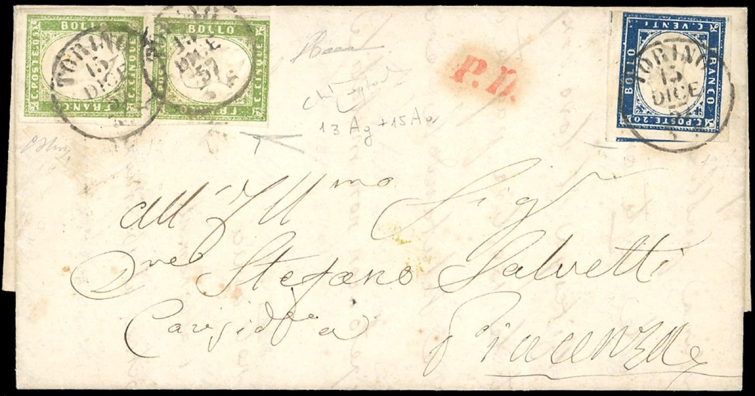 1857 - 5 cent. verde giallo olivastro, coppia verticale, 20 cent. azzurro oltremare scuro (13Ag,15Aa), ottimo stato, su lettera da Torino 15/12/1857 a Piacenza, bollo PD in rosso. Interessante e non comune. G.Oliva, Raybaudi, Diena, cert. Bottacchi.
