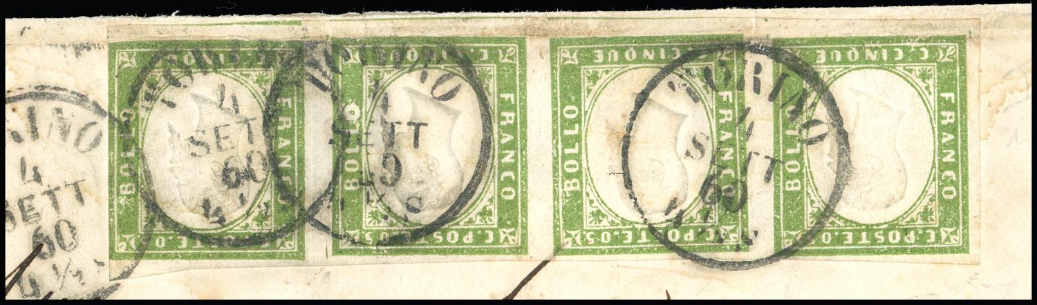 1860 - 5 cent. verde oliva grigiastro chiaro (13Bd), striscia orizzontale di quattro, lievi difetti, su sovracoperta di lettera senza i lembi laterali, da Torino 4/9/1860 a Modena. Rara e di ottimo aspetto. Cert. Colla. Ex coll. Hess.