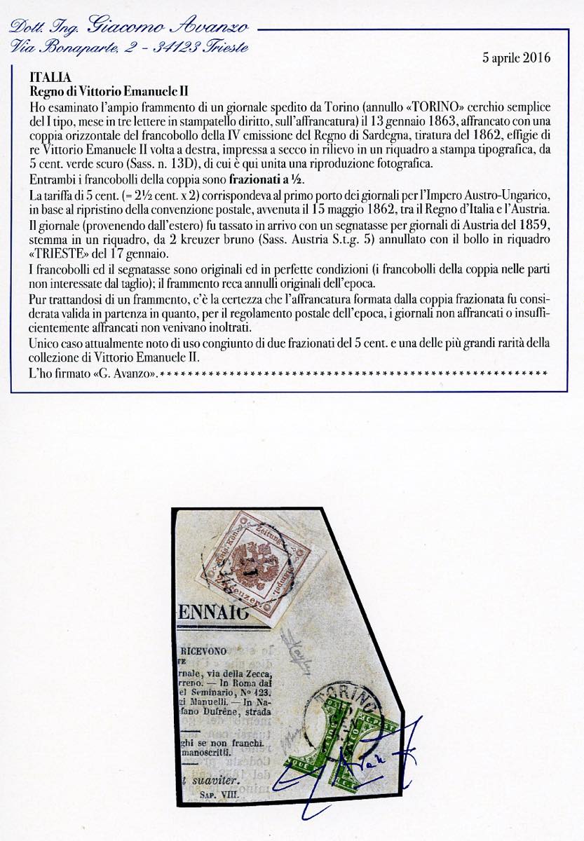 1863 - 5 cent. verde scuro (13D), coppia orizzontale con entrambi i francobolli frazionati a metà, su ampio frammento di giornale da Torino 13/1/1863 a Trieste, dove è stato tassato con 2 kr. bruno segnatasse per giornali (Unificato 3). Pur trattandosi di un frammento, c'è la certezza che l'affrancatura formata dalla coppia frazionata fu considerata valida in partenza in quanto, per il regolamento postale dell'epoca, i giornali non affrancati o insufficientemente affrancati non avevano corso postale. UNA DELLE MASSIME RARITA' DEI FRAZIONATI DELLA IV EMISSIONE DI SARDEGNA ed unico caso noto di uso congiunto di due frazionati da 5 cent. G.Oliva, Raybaudi, cert. Avanzo.