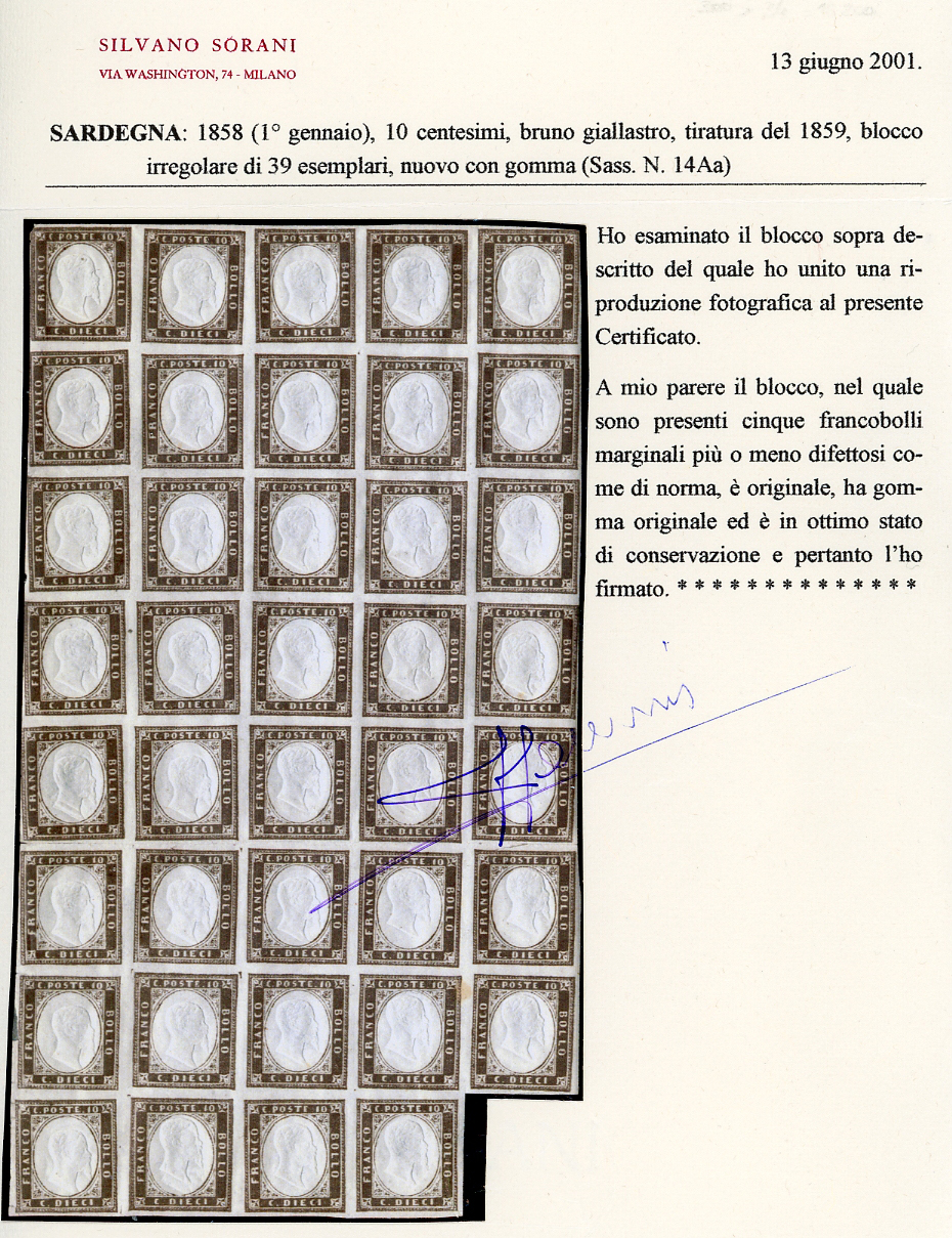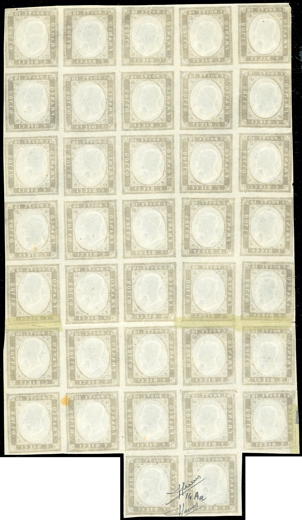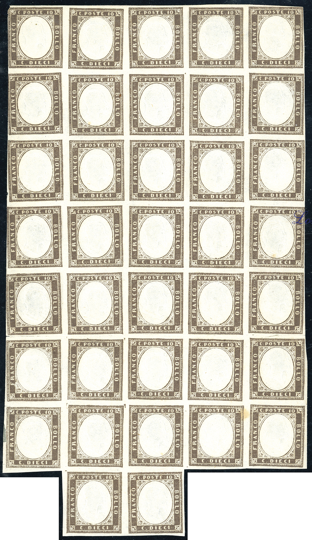 1859 - 10 cent. bruno giallastro (14Aa), blocco di trentanove esemplari, gomma originale, integra per i trenta esemplari, perfetto ad eccezione di cinque esemplari marginali più o meno difettosi. Molto fresco. Cert. Sorani.