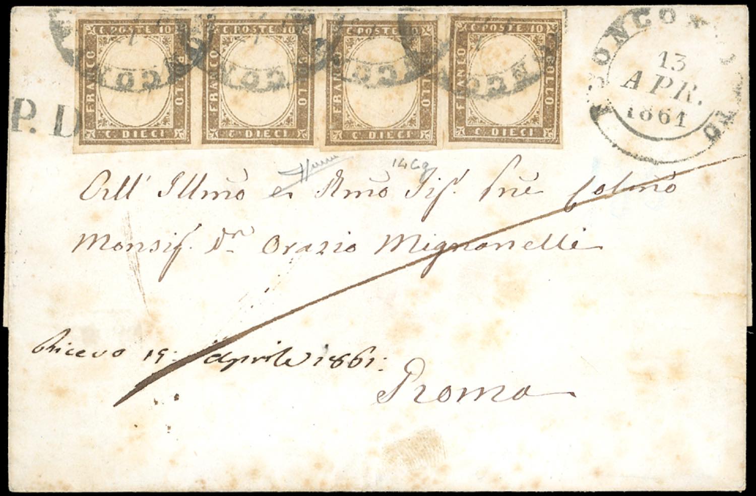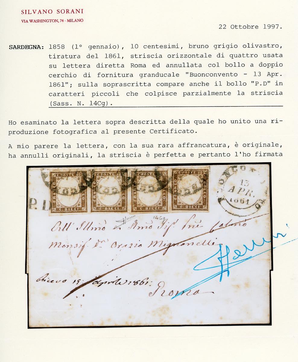 1861 - 10 cent. bruno grigio olivasto (14Cg), striscia orizzontale di 4, sfiorata a destra, su lettera da Buonconvento 13/4/1861 a Roma, non tassata perché diretta ad un Monsignore. Non comune. Cert. Sorani.