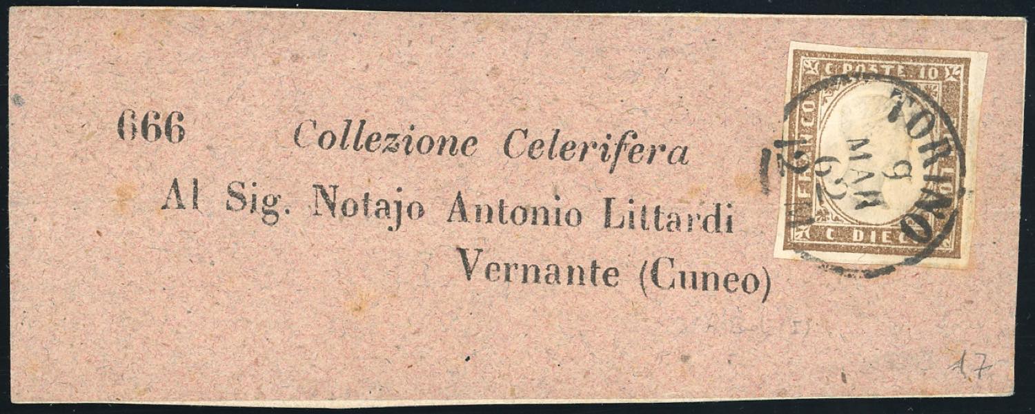 1862 - 10 cent. bruno cioccolato chiaro (14Ck), perfetto, su fronte di fascetta completa di stampato di cinque porti da Torino 9/3/1862 a ... Leggi tutto