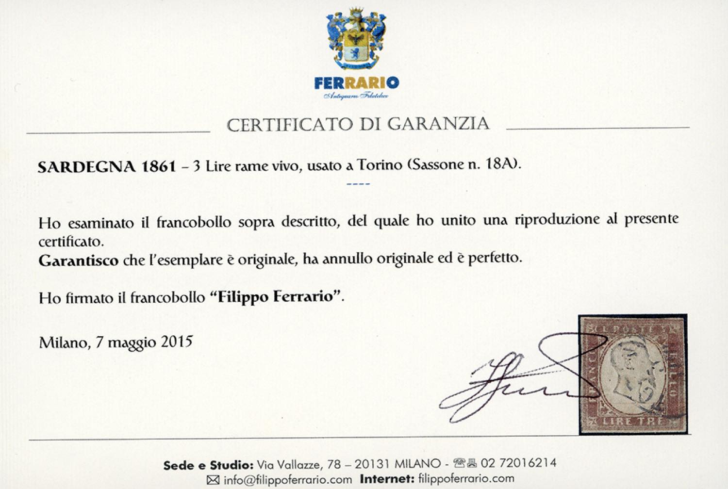 1861 - 3 lire rame vivo (18A), perfetto, usato a Torino. Em.Diena, cert. Ferrario.