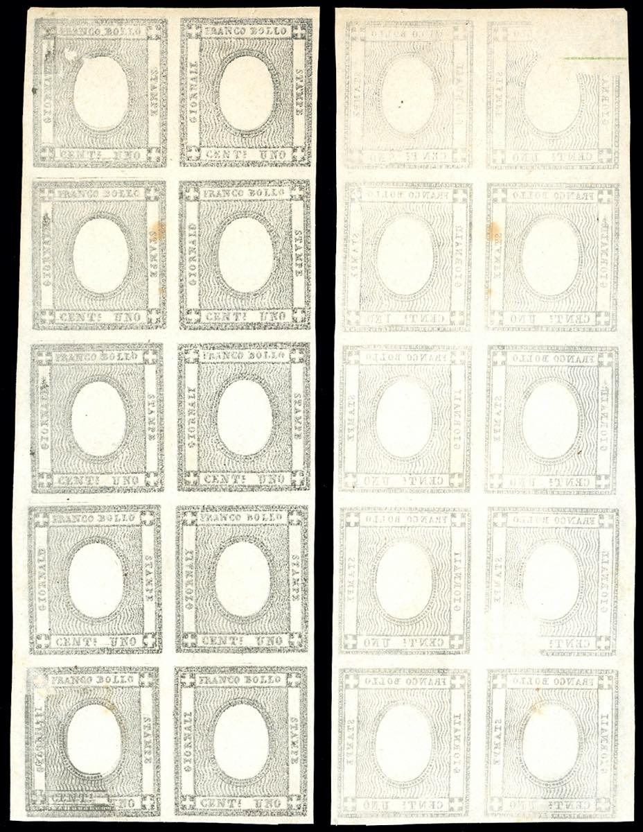 1861 - 1 cent. grigio nero (19), prova di macchina con stampa confusa, decalco al verso, senza cifra a rilievo "1", blocco di 10 esemplari, ... Leggi tutto