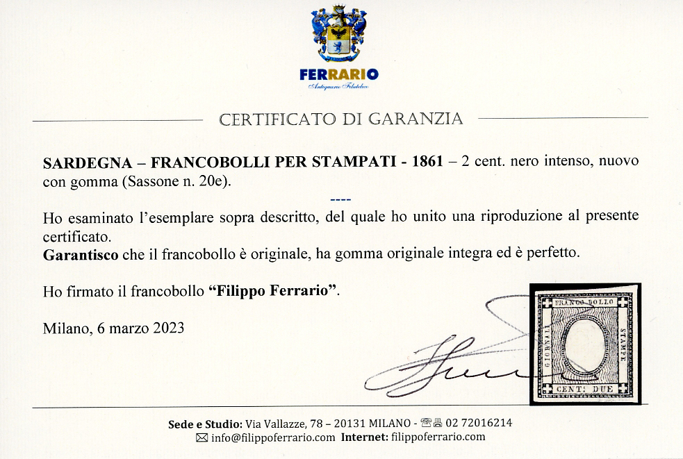 1861 - 20 cent. nero intenso (20e), gomma originale integra, perfetto. Rara tonalità. Cert. Ferrario.