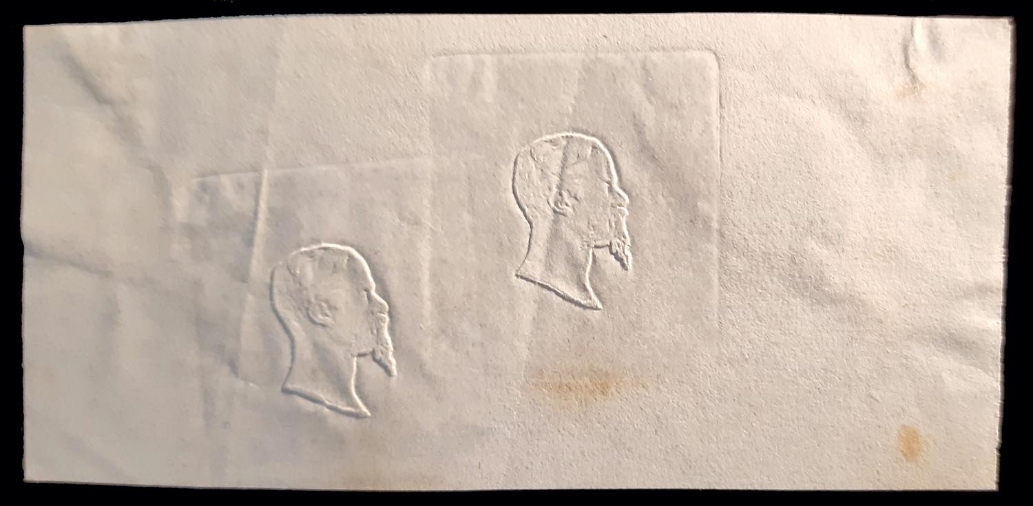 1855 - Prova di conio della sola effigie ripetuta due volte su foglietto di carta sottile, cm. 7 x 3,5 ca., ottimo stato. Interessante.