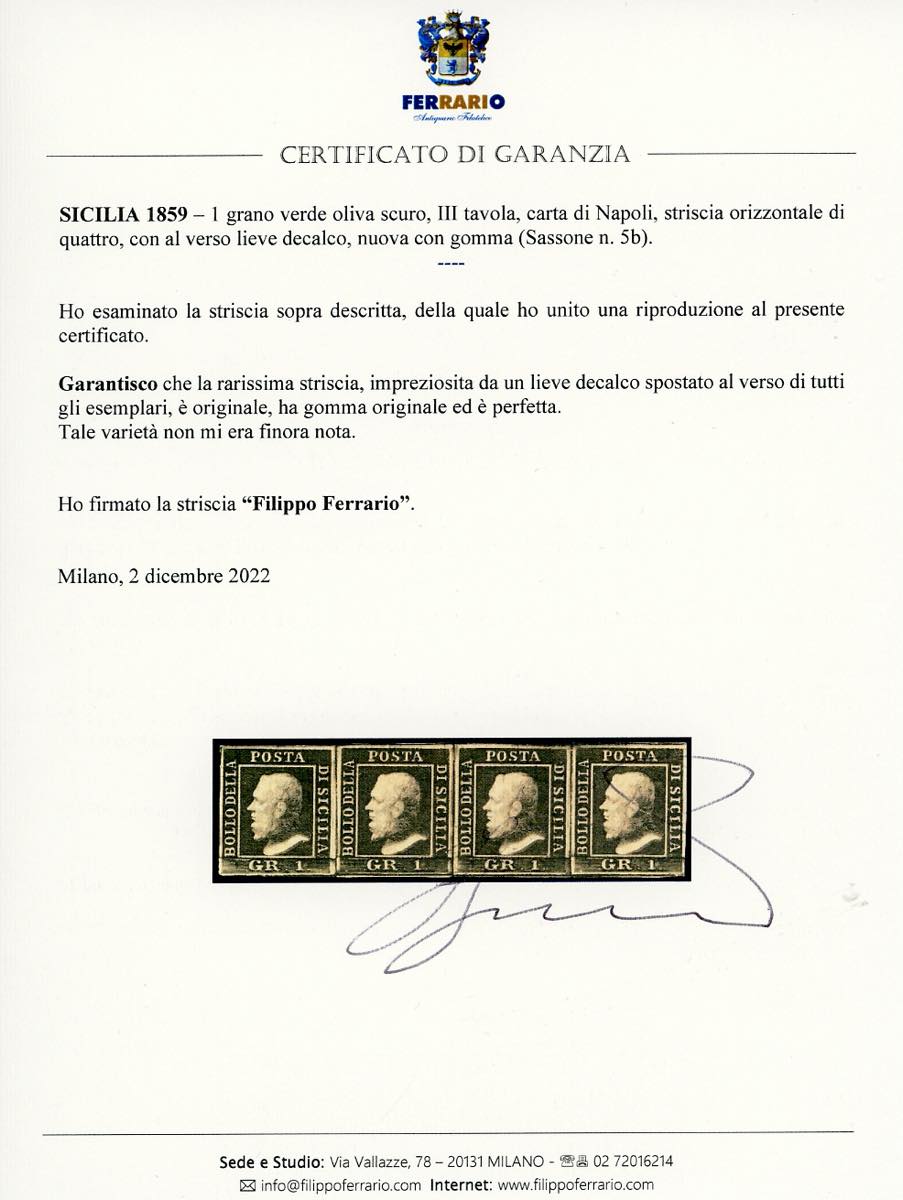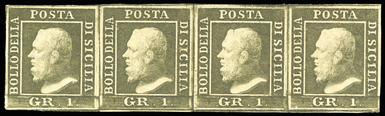 1859 - 1 grano verde oliva scuro, III tavola, carta di Napoli (5b), striscia orizzontale di quattro, al verso lieve decalco spostato su ... Leggi tutto