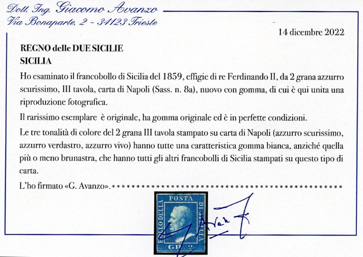 1859 - 2 grana azzurro scurissimo (8a), gomma originale, perfetto. Rara tonalità, di grande freschezza, Emilio Diena, cert. Avanzo.